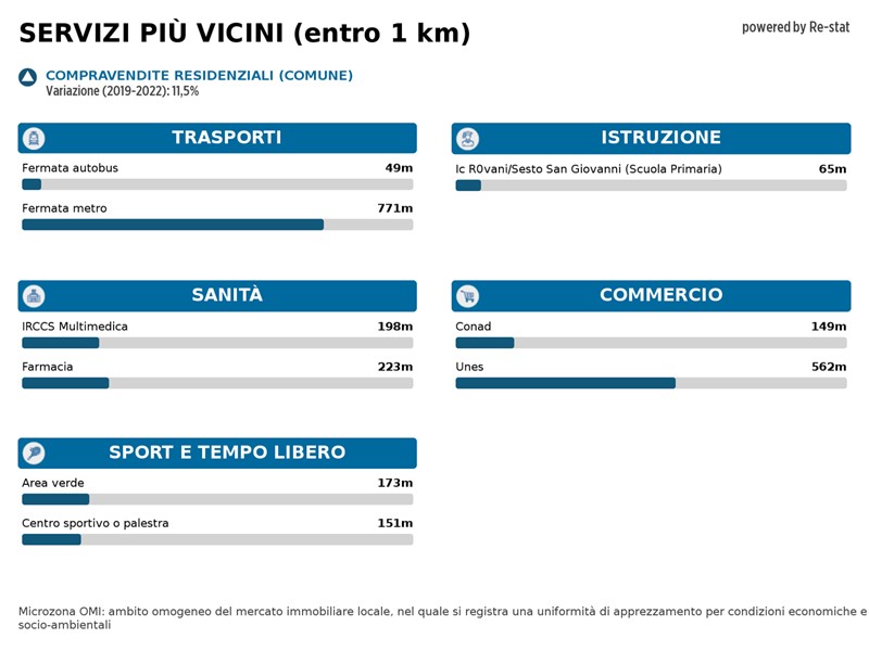 L'immobile si trova in una zona ben servita dai mezzi pubblici, con la metropolitana Sesto Rondo a pochi passi. Nelle vicinanze sono presenti supermercati, attività commerciali, scuole, asili, uffici postali e sportelli bancari, rendendo la zona estremamente comoda e vivibile.