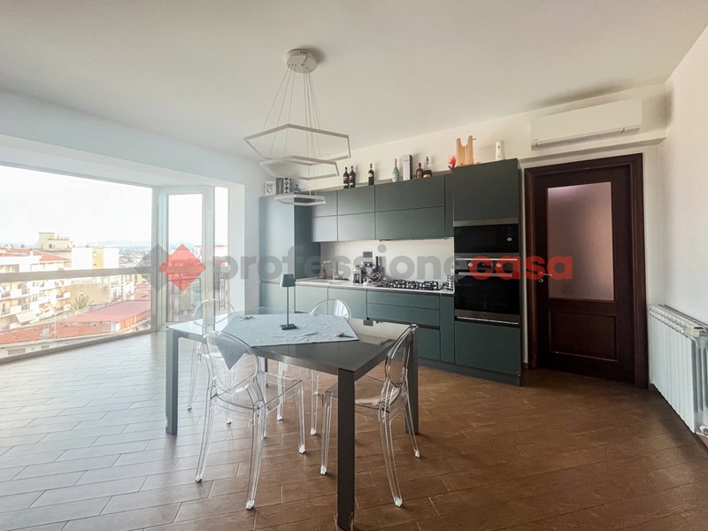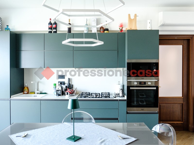 L'ingresso si apre su un'ampia e luminosa zona living con cucina a vista, arricchita da un comodo balcone e un' ampia vetrata che si affacciano sulla vista della città.