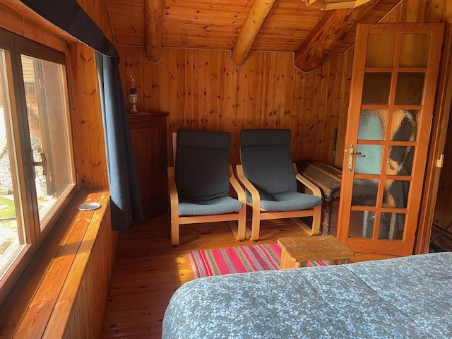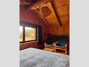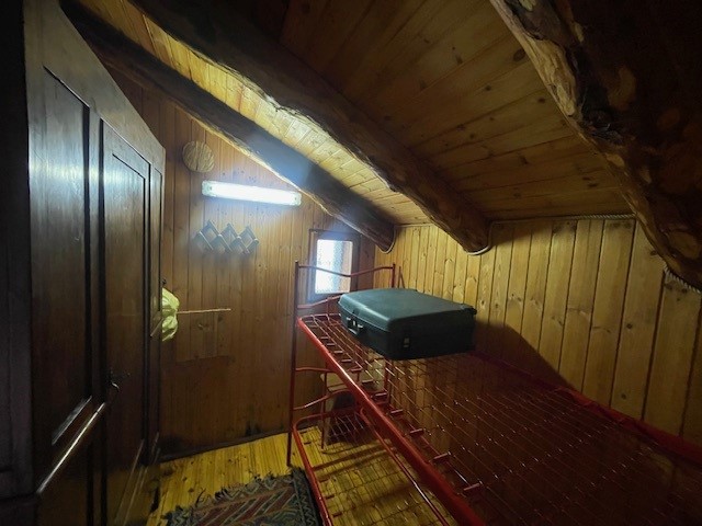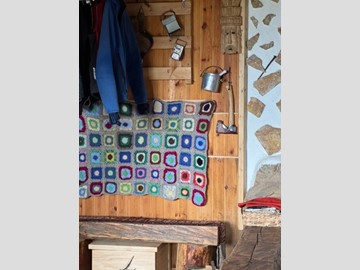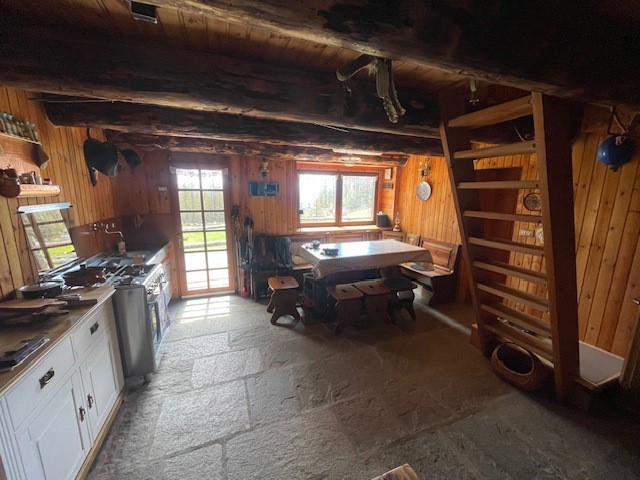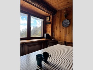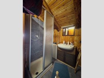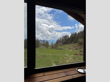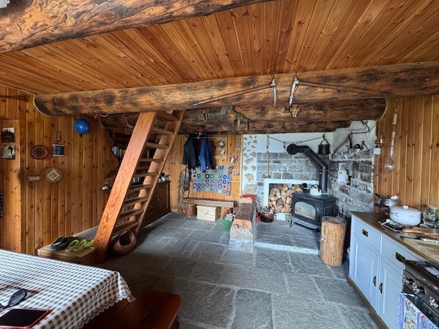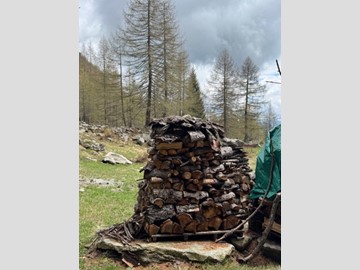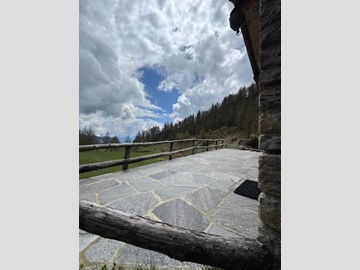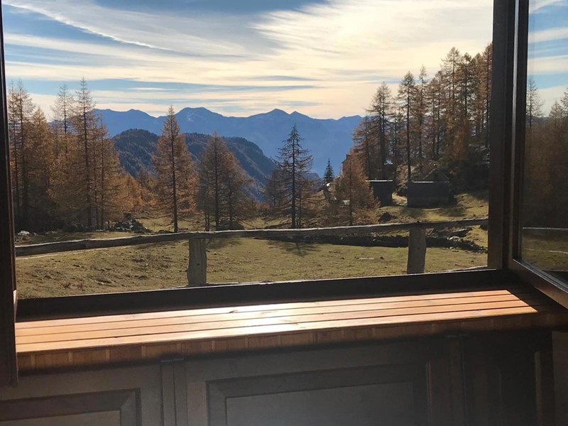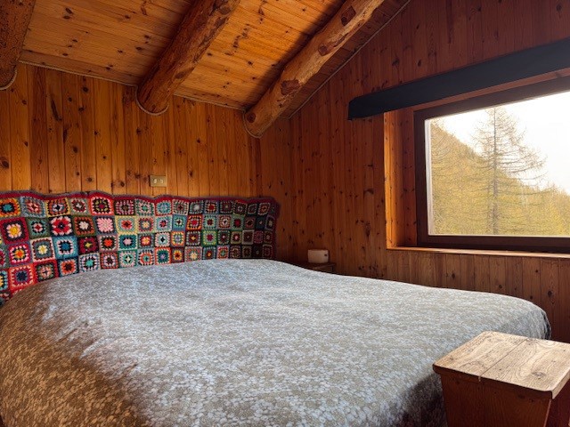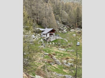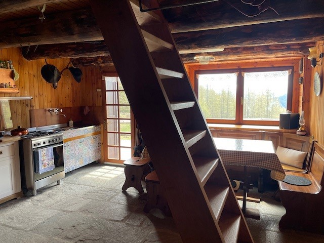 In una zona integra e protetta sul margine del pascolo, la baita si eleva su due piani e comprende al pian terreno un ampio soggiorno con cucina completa ed un alto ripostiglio, con legnaia esterna e, con scaletta interna in legno, nel sottotetto, una camera principale luminosa, altra cameretta e bagno. L'edificio è collegato alla rete elettrica ed idrica (da fonte con accumulo) ed il riscaldamento è assicurato con stufa a legna.