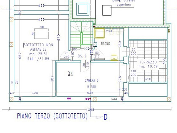 Appartamento di 4 locali per complessivi 156 mq. commerciali circa disposto su due livelli (secondo e terzo abitativo). Tramite vano ascensore che sbarca al piano secondo, accediamo all'abitazione così composta: ingresso sulla zona giorno con cucina a vista con accesso diretto al terrazzino di facciata, servizio e n. 2 camere da letto; tramite la scala interna accediamo al secondo livello (p. 3° attico) di ampie dimensioni adibibile a terza camera/locale hobby con ulteriore locale di servizio e terrazzo.