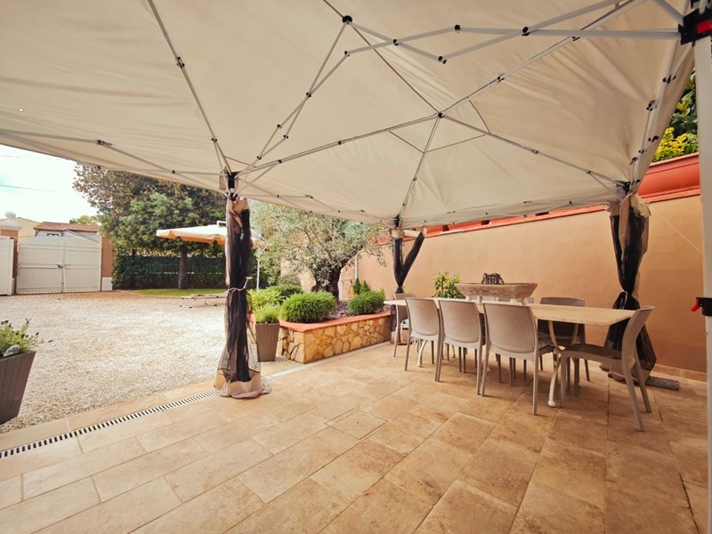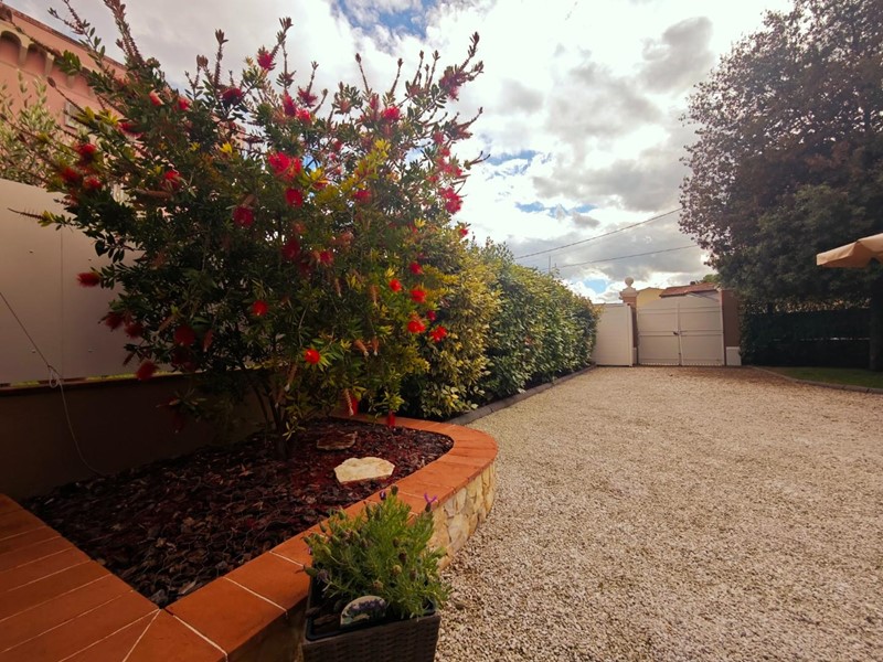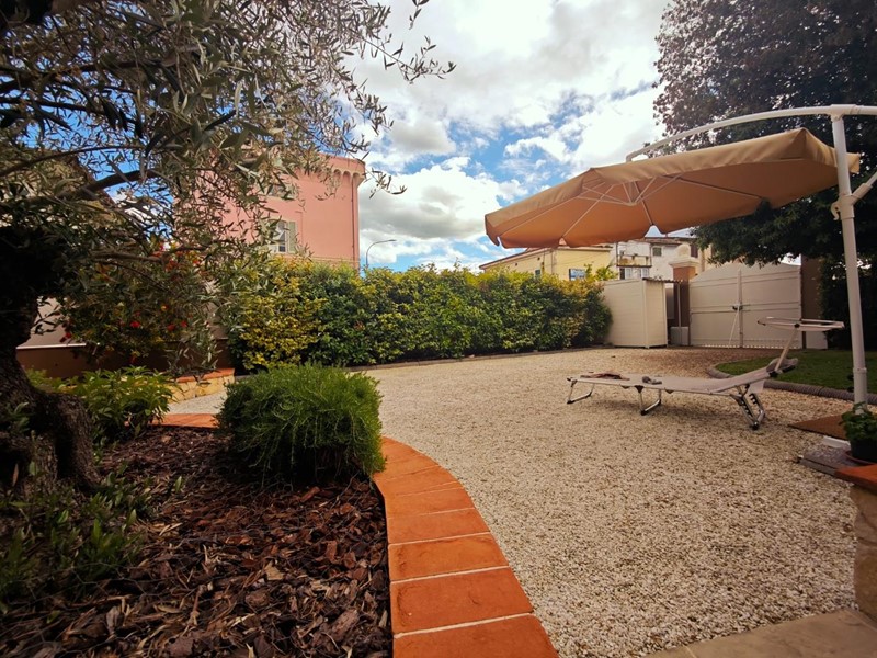 Abbiamo accesso all'immobile da un sontuoso cancello che ci introduce nel giardino, finemente studiato per dare valore all'ampio spazio esterno decorato con aiuole, ghiaia bianca e resede pavimentato all'ingresso dell'abitazione. Questo spazio esterno dispone di bellissima veranda e di un angolo divanetti per cene all'aperto, e area relax.