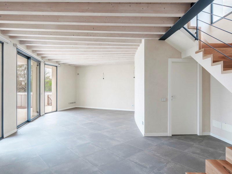 Le unità immobiliari sono sviluppate su due livelli: la grande zona giorno al piano terra con l'affaccio sui portici e sul giardino; la zona notte al primo piano gode della splendida vista dalle terrazze sulla campagna circostante.