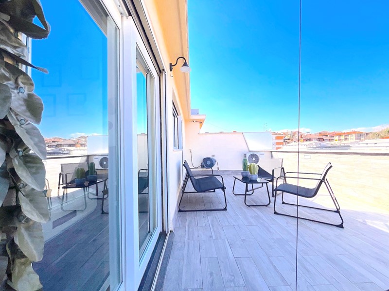 L'unità abitativa si compone di un luminoso soggiorno, una cucina completamente arredata e dotata di ogni comfort, una spaziosa camera matrimoniale e un servizio. L'appartamento è inoltre dotato di impianto di climatizzazione e riscaldamento termocontabilizzato, garantendo un elevato livello di comfort in ogni stagione. La doppia esposizione offre un'ottima luminosità e una vista panoramica sulla città.