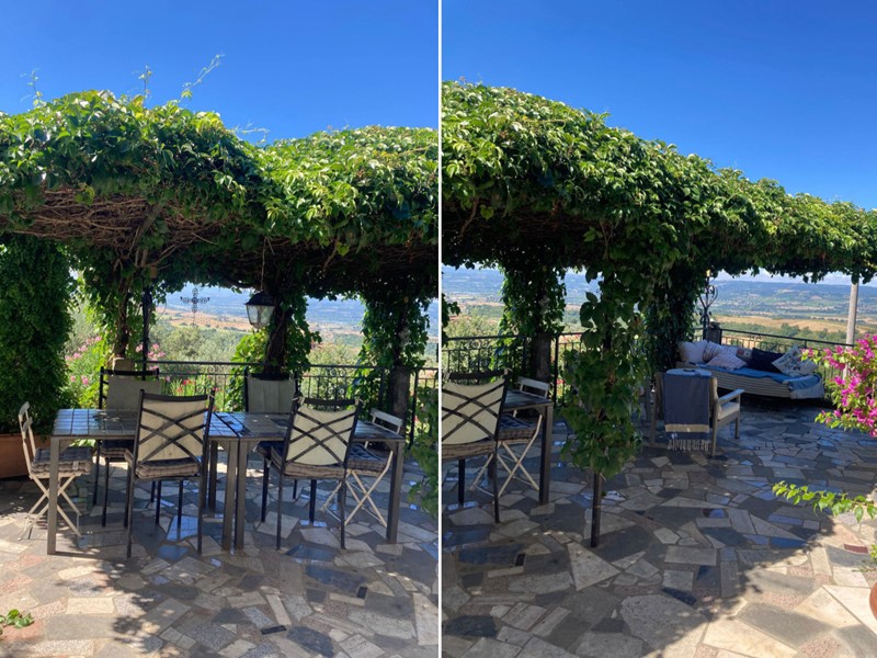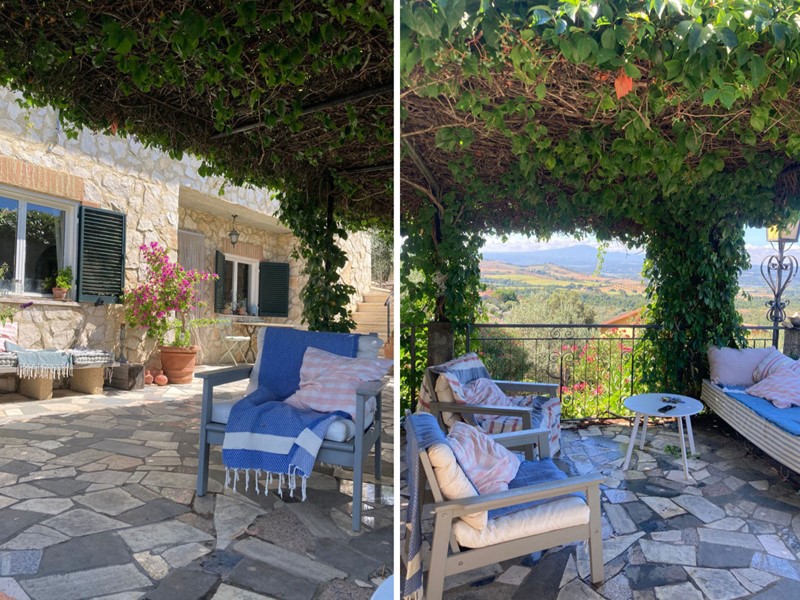 Di fronte alla casa, con accesso diretto dalla cucina, troviamo una terrazza panoramica con un bellissimo pergolato (con un tavolo lungo per splendidi pranzi e cene...), un forno a legna, un giardino ricco e colorato e per a coronare l'opera, nascosta tra i 70 ulivi, troviamo anche una piscina fuori terra (possibilità di realizzare anche una piscina interrata)
