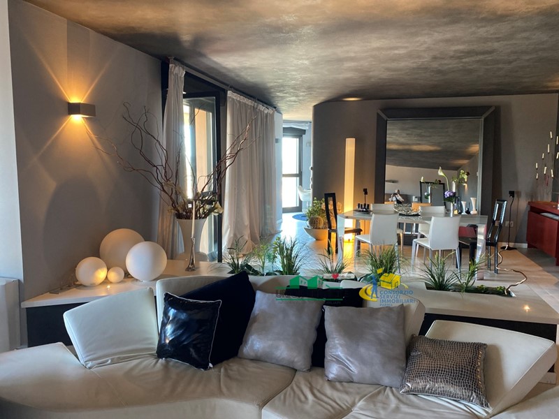 L'appartamento è composto da soggiorno, dotato di caminetto ad effetto integrato nel mobile TV, con affaccio su loggia abitabile e accesso al grande terrazzo; cucina con loggia e zona pranzo panoramica; disimpegno; 3 camere matrimoniali (una con loggia); 2 bagni (uno con loggia); ampia lavanderia / ripostiglio con accesso al terrazzo. Cantina e garage.