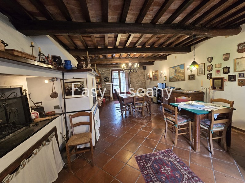 Piano Primo con accesso da scalinata in pietra esterna oltre che collegamento interno, su sala di circa 50mq. con camino del 1700, ampia scalinata in noce massello per il piano superiore, grande tipica cucina toscana, sala da pranzo. Piano secondo: quattro camere da letto e due bagni. Giardino, lavanderia, garage, cantina, locale impianti tecnici.