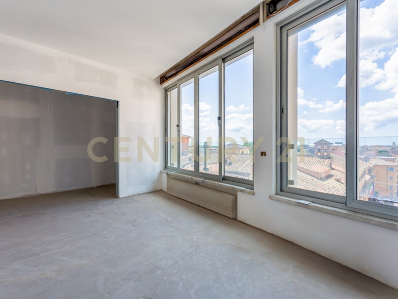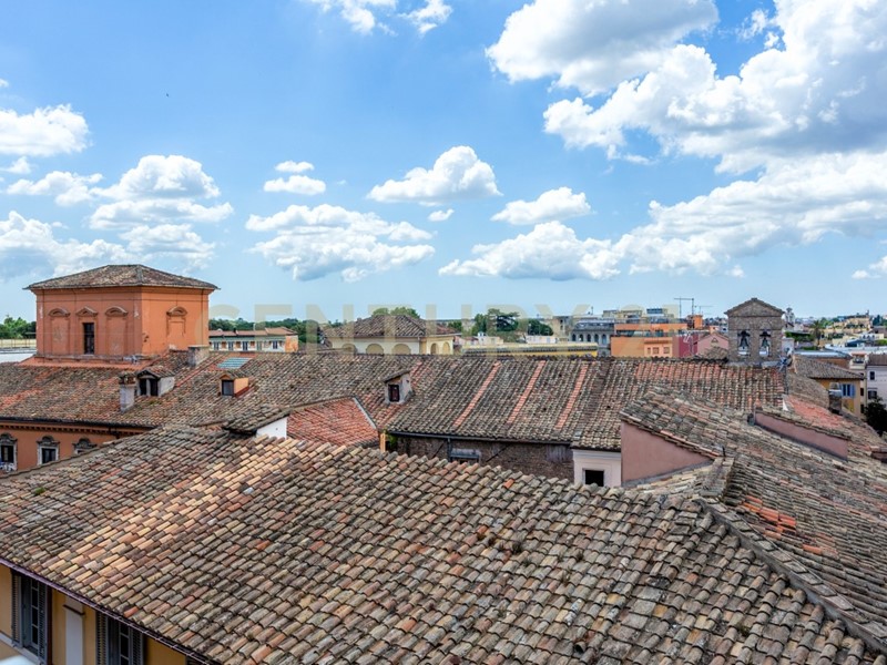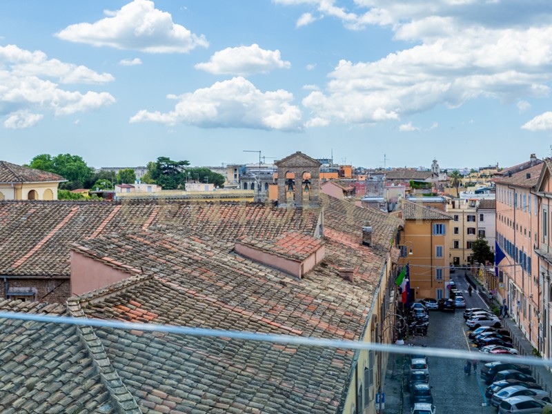 La grande vetrata panoramica che circonda l APPARTAMENTO regala una vista mozzafiato sui tetti della Roma storica, creando un’atmosfera luminosa e suggestiva in ogni momento della giornata.
