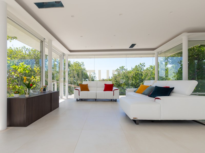 La Villa presenta un taglio moderno, ricco di vetrate che creano un continuum con l'esterno.