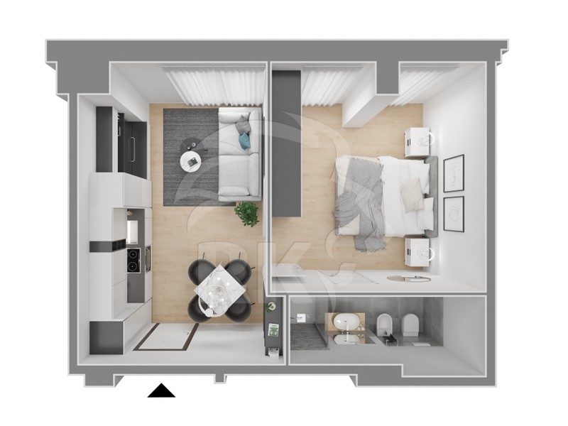 SOLUZIONE NR. 0.01-MONOLOCALE (P.TERRA) - Ingresso su unico vano con angolo cottura, zona notte e bagno.