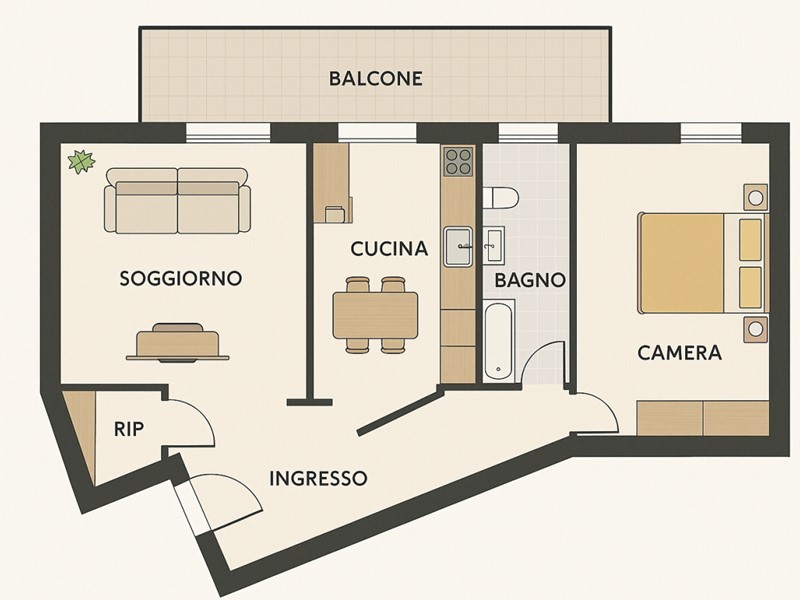 L’appartamento è composto da ingresso, soggiorno, cucina abitabile, camera matrimoniale, bagno con finestra, pratico ripostiglio e balcone.