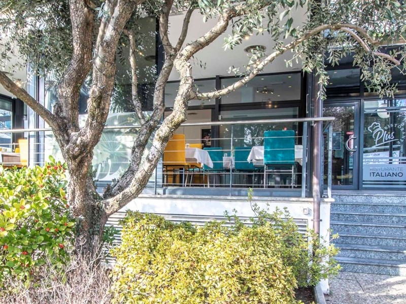 Luminoso open space con reception, zona bar, grande sala interna, cucina attrezzabile, doppi servizi e splendido dehor vetrato di 30 mq