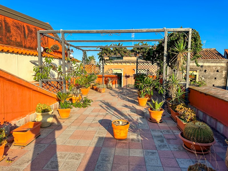 Elemento distintivo della casa è il terrazzo soprastante di pertinenza esclusiva, della stessa superficie dell’abitazione: un vero gioiello con vista panoramica sul mare da un lato e sull’Etna dall’altro. Questo spazio è curato in ogni particolare, attrezzato con tavolo e sedie, gazebo ombreggiato da una vite rampicante e decorato con piante tipiche del luogo. I teli bianchi offrono ristoro nelle calde giornate estive, regalando un’atmosfera rilassata e mediterranea. Ideale per organizzare cene estive, un aperitivo in compagnia o festeggiare una ricorrenza con gli amici.