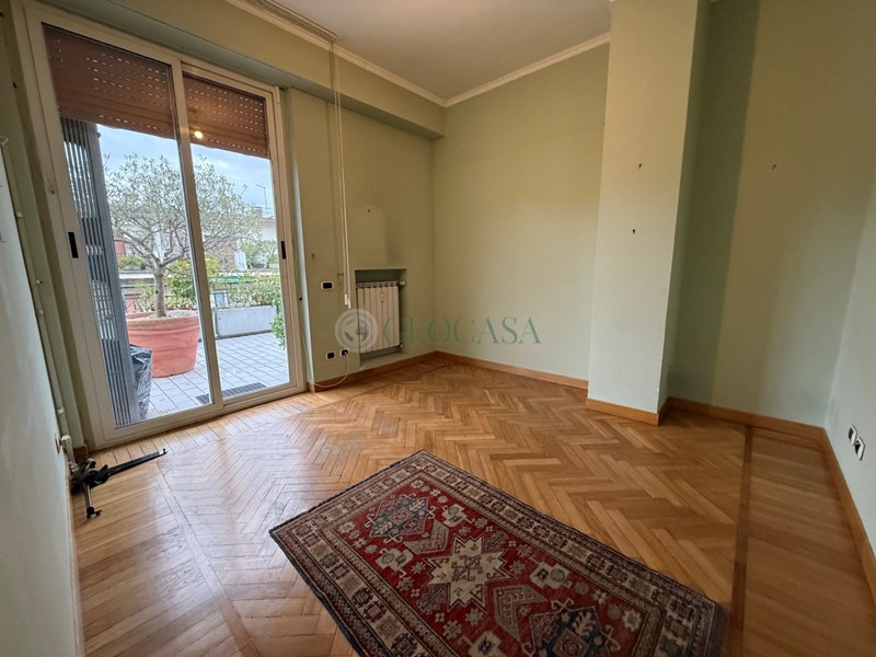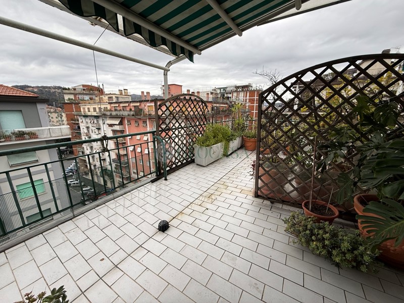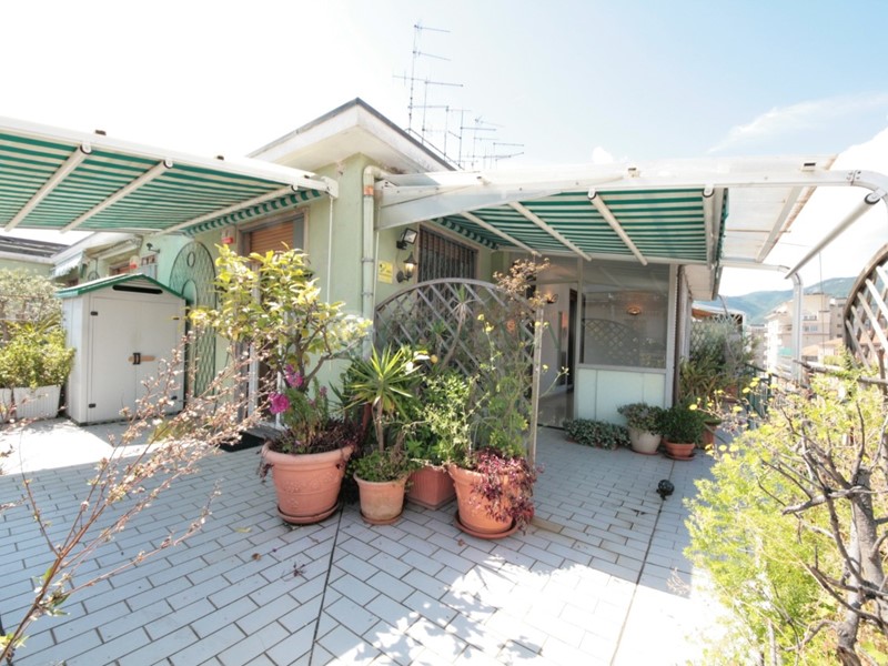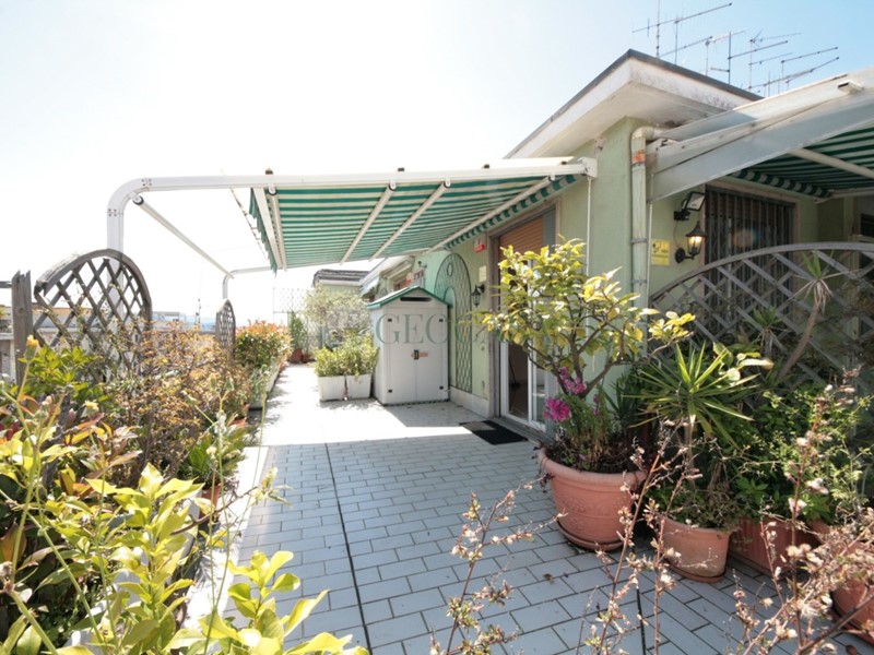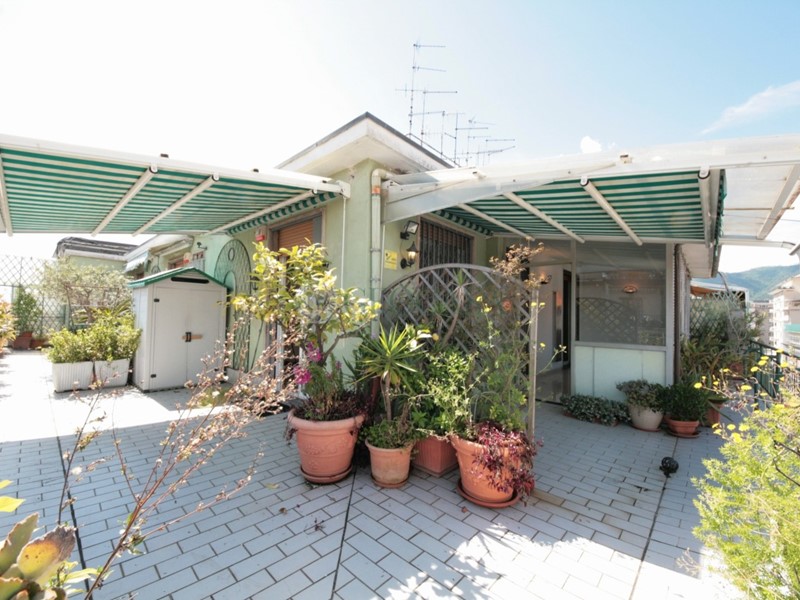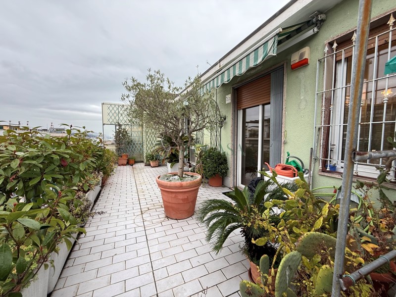 VIA VENETO - AD.ZE OSPEDALE, in zona servita e ben collegata, in stabile anni '60 con ascensore proponiamo all'ultimo piano luminoso attico con esposizione angolare e terrazza di 100mq con vista mare che circonda l'intero appartamento. L'immobile, in ottime condizioni, è attualmente suddiviso in: ampio ingresso su zona giorno angolare, cucina abitabile con comodo accesso a veranda pranzabile, tre camere, doppi servizi entrambi finestrati di cui uno con balcone, ampio ripostiglio/lavanderia. I soffitti sono alti, la porta blindata, gli infissi doppi vetro in alluminio, avvolgibili elettrici, aria condizionata, impianto di allarme, tende da sole. Riscaldamento centralizzato con termovalvole.