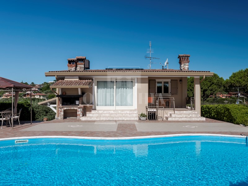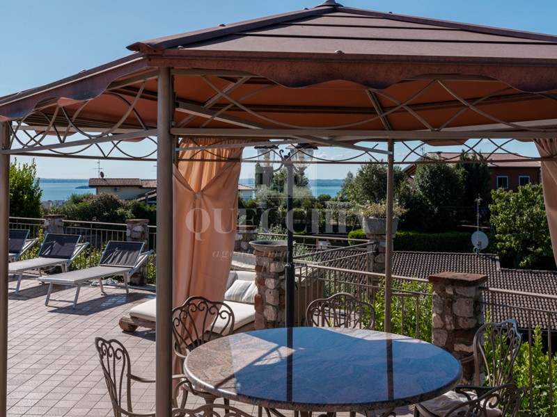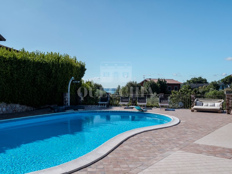 Lo spazio esterno, panoramico con scorci di lago, ospita un lastricato, la piscina, il gazebo e un'area verde, oltre a box doppio ed ampi spazi di parcheggio coperti.