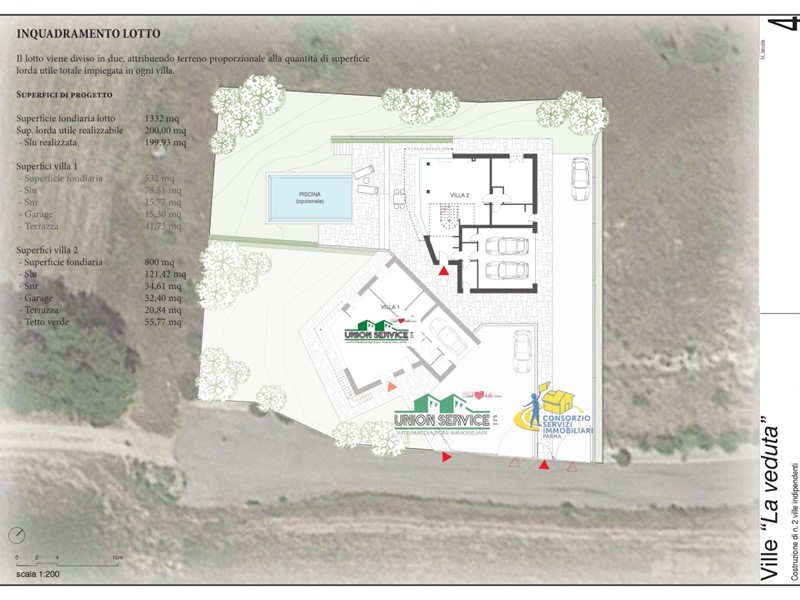 L’area può essere utilizzata per intero per la realizzazione di una villa monofamiliare oppure viene divisa in due parti per la realizzazione di due ville con caratteri simili ma di dimensioni diverse. Entrambe si affacciano sulla vallata, la prima verso sud e la seconda