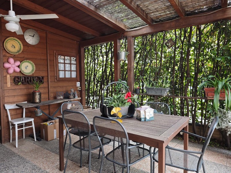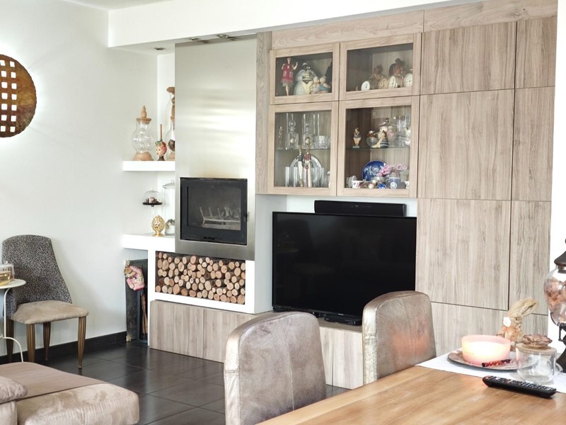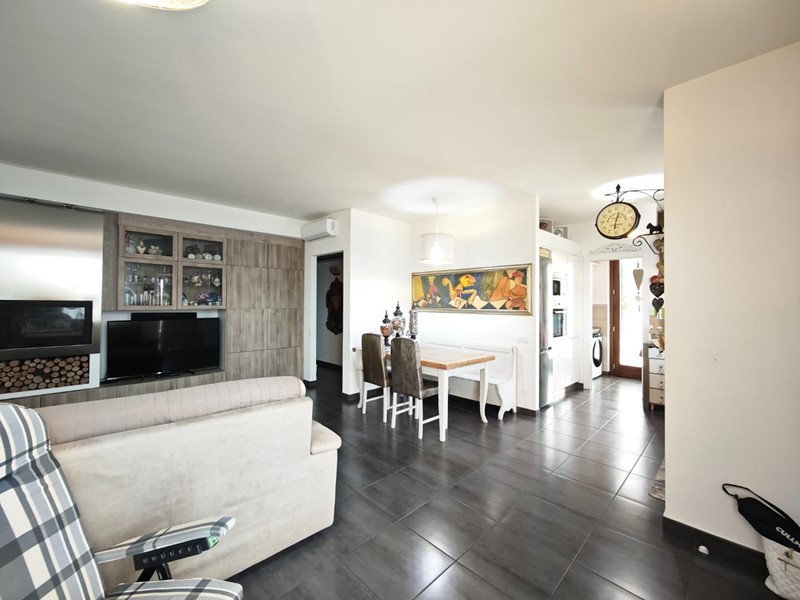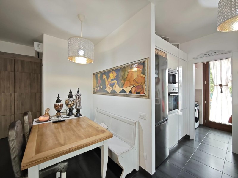 La zona living si sviluppa anche all'esterno nel resede che gode di un'ampia veranda in legno; interno ed esterno creano una sinergia armoniosa e spaziosa e danno modo di vivere tutto l'appartamento con comodità e ampia libertà di movimento tra questi spazi.