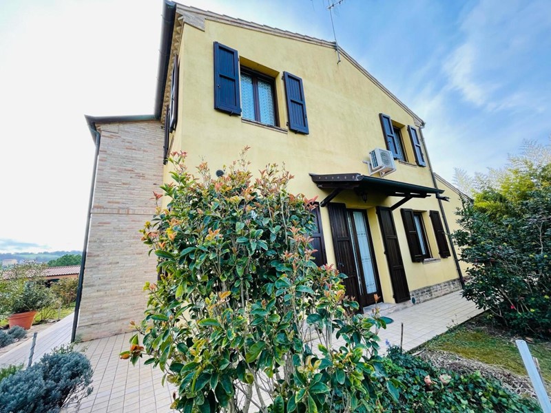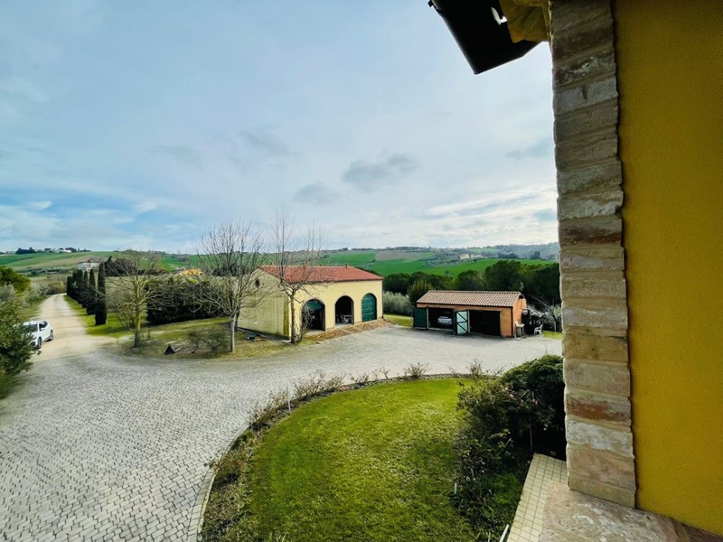 Dal cancello e tramite un bel vialetto alberato accediamo alla proprietà che è composta da diversi fabbricati, la casa padronale di circa 250 mq in ottimo stato con ingresso sulla grande zona giorno con tavolo da pranzo, salotto con caminetto, cucina abitabile, bagno e studio. Salendo la scala in legno si arriva la piano 1 composto da 3 grandi camere matrimoniali e 2 bagni. Si puo' accedere anche autonomamente dalla tipica scala esterna delle case coloniche marchigiane. La casa si presenta in perfette condizioni di pavimentazione, infissi, impianti etc..