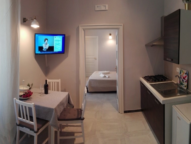 Prima ala: ingresso su soggiorno con cucina e balcone, camera da letto con balcone, bagno.