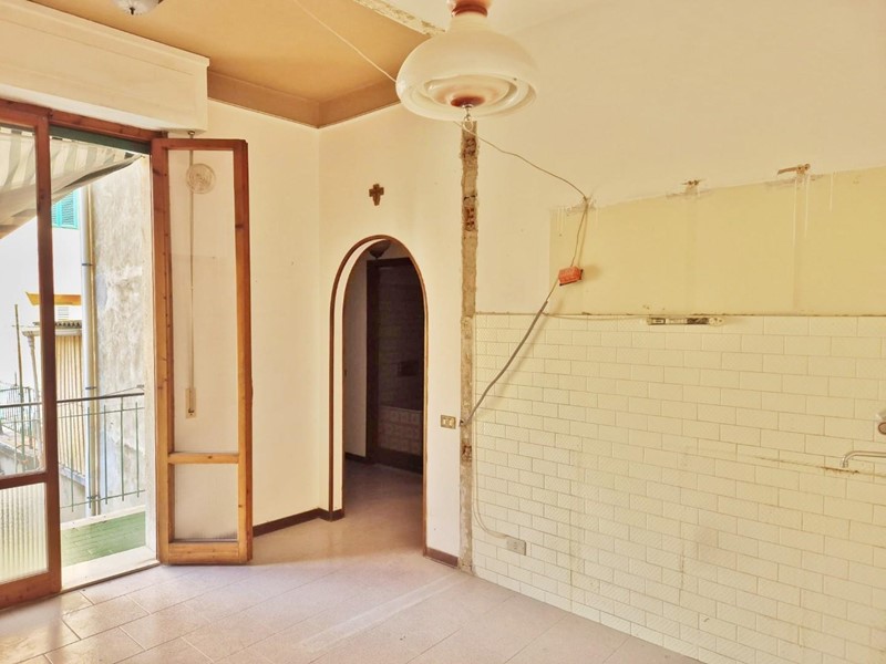 Piano primo (circa 60 mq): appartamento con ingresso, cucina con terrazzo di 5,70 mq, due camere e bagno con finestra.
