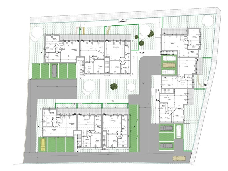 Sono disponibili 18 appartamenti tra piano terra e primo piano, con superfici da 88 a 100 mq, dotati di ampie terrazze o spazi esterni abitabili e posto auto privato da 14 mq incluso.