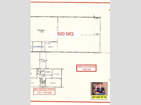Superficie a pavimento pari a 750 mq complessivi, composta di un Capannone di mq 500 con altezza 6 metri, 2 portoni carico, possibilità di un terzo portone per mezzi ingombranti; il tutto collegato ad una palazzina uffici di 260 mq suddivisa in più stanze; piazzale di antistante per circa 1000 mq, su lotto complessivo di 2000 mq. 2 cancelli carrai. Per info CARLO GUERRA 347 035 97 45.