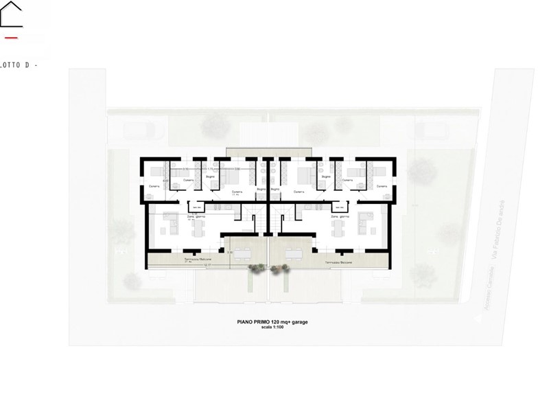 Gli appartamenti al piano primo prevedono anch' essi un' AMPIA METRATURA distribuita su un unico livello e composta da AMPIA ZONA GIORNO con FAVOLOSA TERRAZZA ABITABILE, TRE CAMERE, DOPPI SERVIZI, RIPOSTIGLIO e GARAGE.