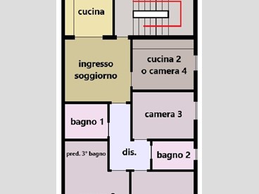 Lo sviluppo di queste 3 possibilità è dato principalmente dal progetto architettonico che vede una distribuzione funzionale ed addirittura la possibilità di un frazionamento in due appartamenti di 3 vani ciascuno. L'attuale dislocazione dei vani, risulta questa:  ingresso/soggiorno con saletta attigua dove è situata una prima zona cottura in prossimità della terrazza abitabile. A seguire l'unità immobiliare offre una vera cucina abitabile per coloro ai quali siano sufficienti 3 camere da letto, oppure ben 4 camere da letto per coloro che ne necessitino. L'appartamento si completa con un disimpegno e due bagni, oltre la predisposizione per un terzo (facilmente realizzabile ove indicato in planimetria).