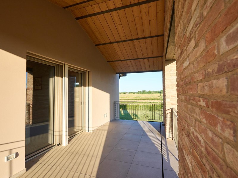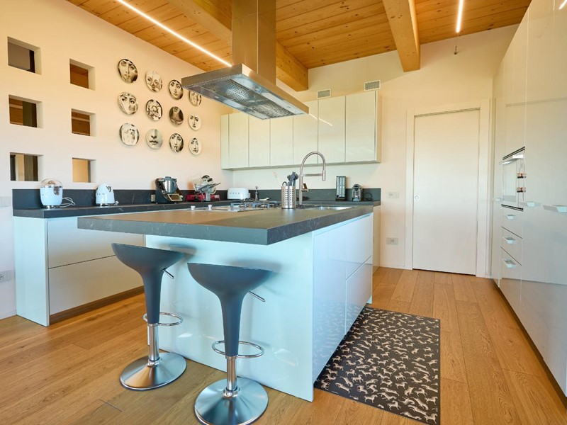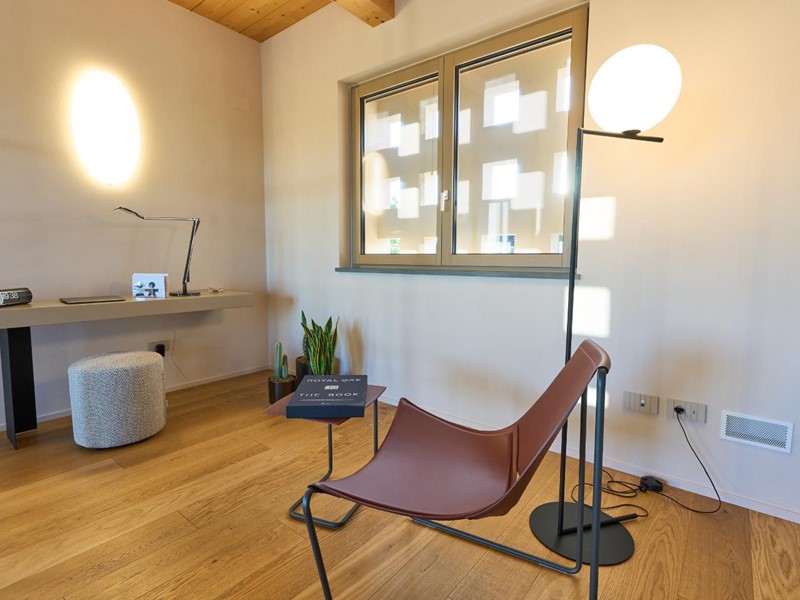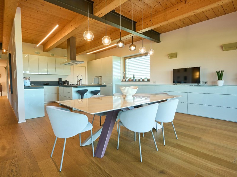Gli interni sono caratterizzati da ambienti generosi e luminosi, inondati dalla luce naturale che penetra attraverso ampie vetrate, mentre il parquet caldo dei pavimenti e le longherine in metallo e il soffitto completamente in legno, conferiscono un'eleganza senza tempo.