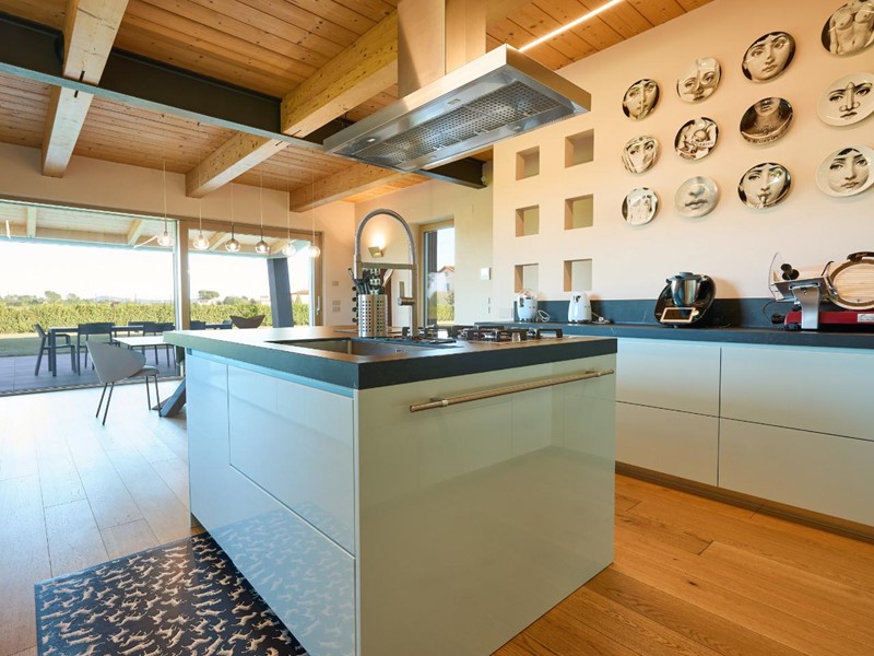 Cucina moderna e conviviale collegata alla zona pranzo, con accesso diretto al loggiato esterno e vista sul parco.