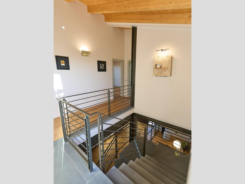 La villa si sviluppa su due piani, collegati da una splendida scala di design , vera protagonista architettonica della casa.