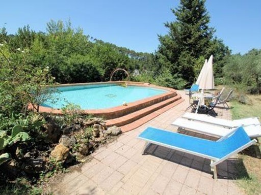 Bel parco esclusivo di 20.000 mq con alberi da frutto, olivi e parte a bosco, un ampio garage, un utile locale cantina/bar, una ampia dependance, una piscina in posizione panoramica.