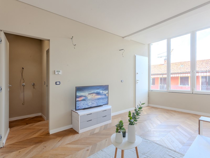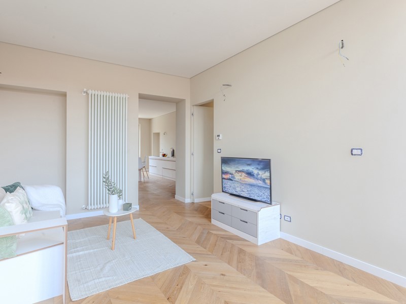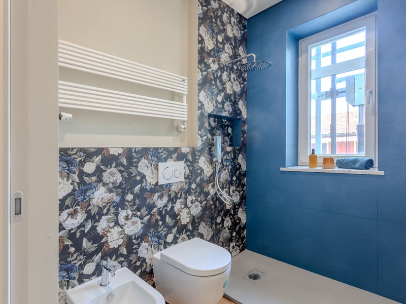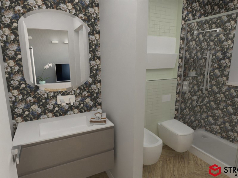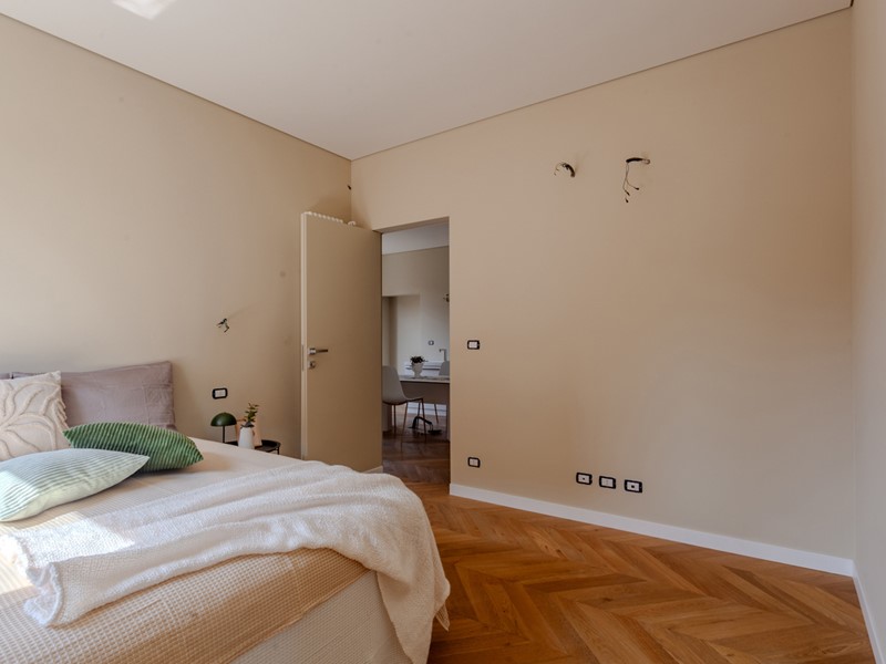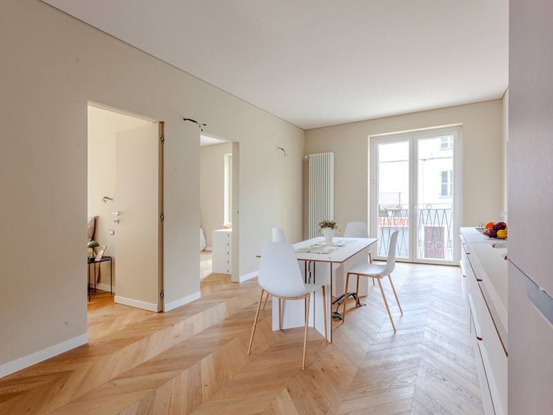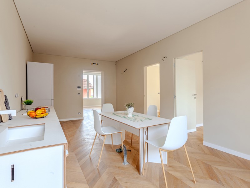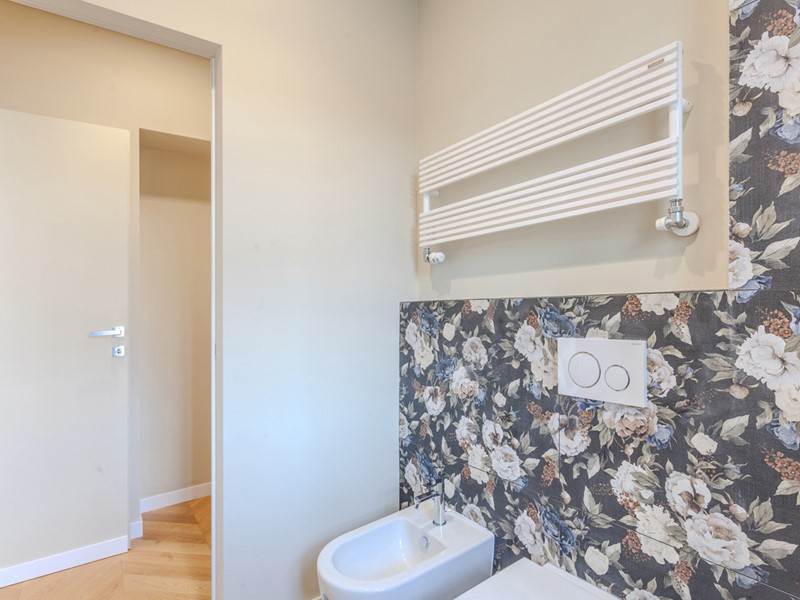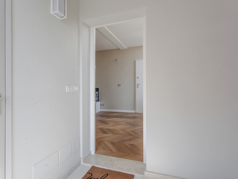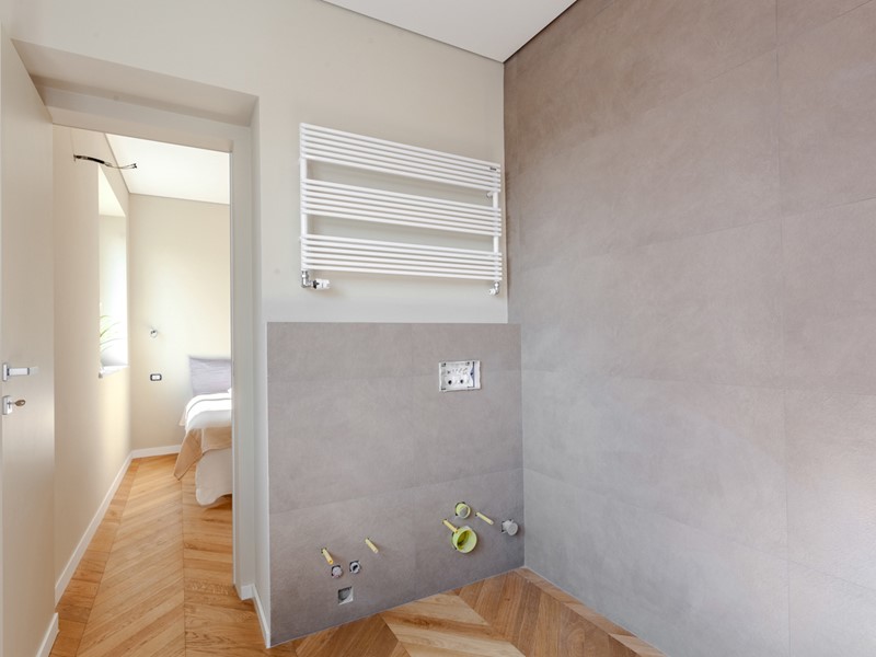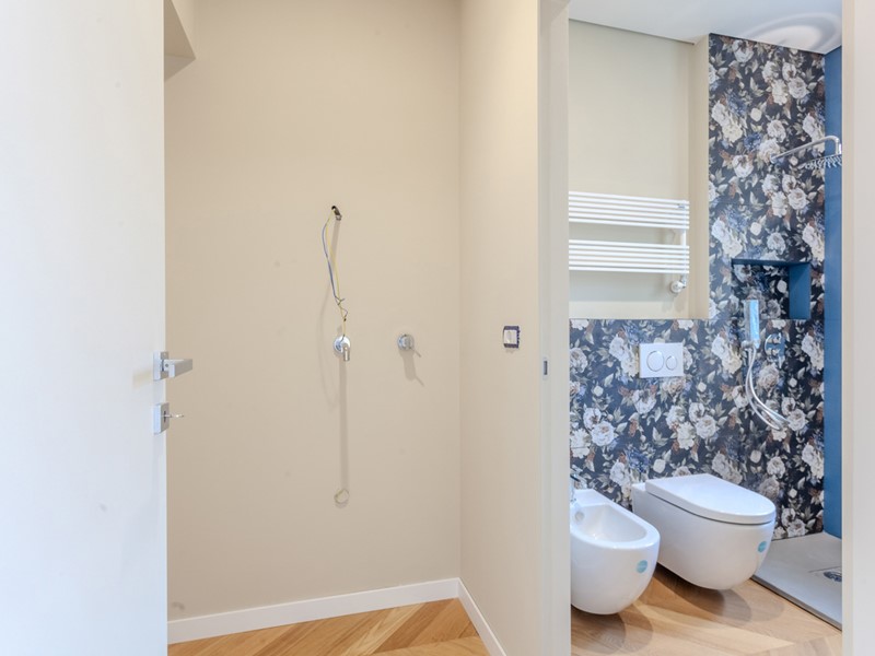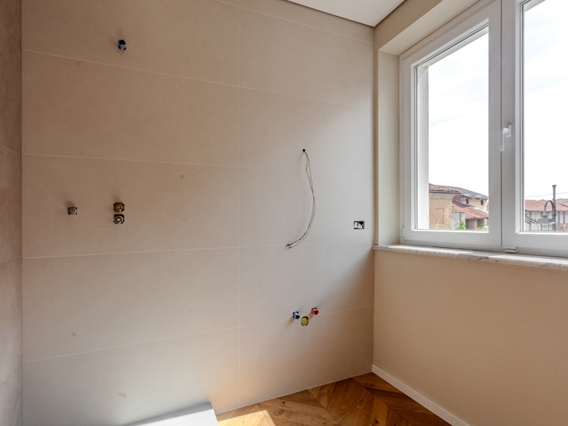 Attualmente l'immobile è già stato pavimentato con uno splendido parquet in rovere a spina di pesce, una soluzione elegante e di grande prestigio, così come sono di tendenza i rivestimenti scelti per i bagni.