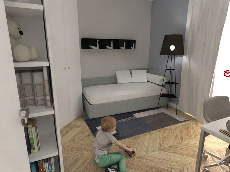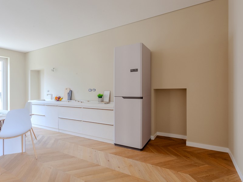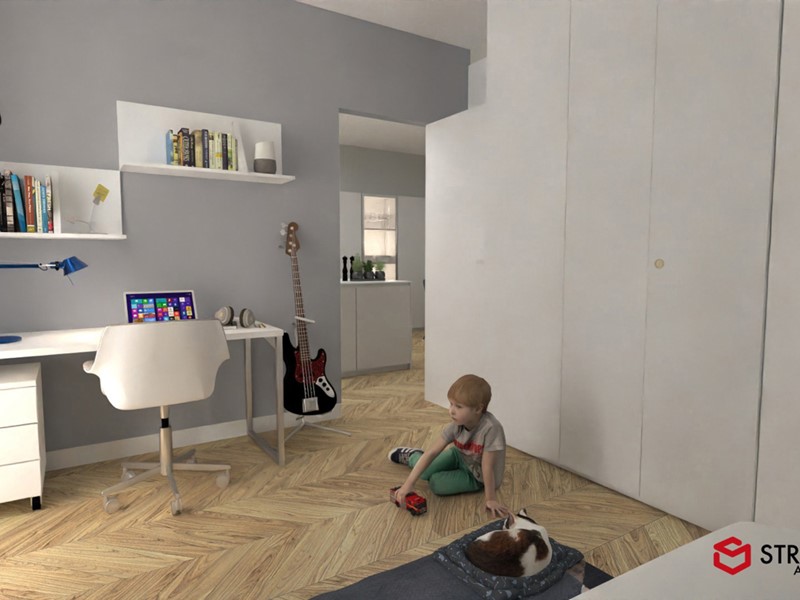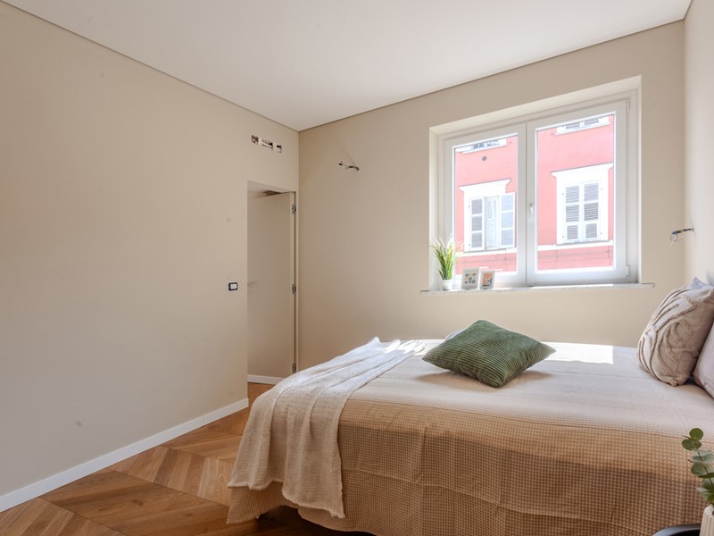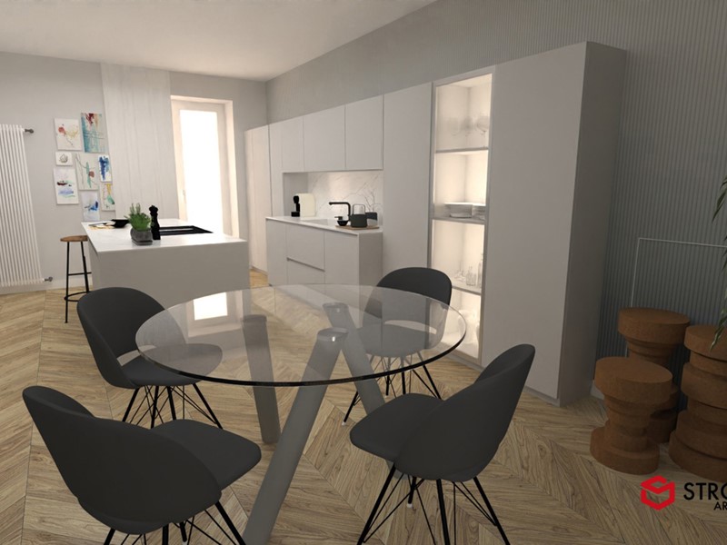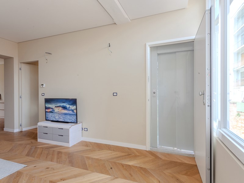 Le sorprese si rivelano già dall'ingresso: l'ascensore approda direttamente in casa, nel soggiorno, una soluzione di grande impatto estetico, ma anche pratico. Il soggiorno si distingue per l'ampia vetrata affacciata sul cortile interno, che instaura un armonico scambio luminoso fra interno ed esterno. La spaziosa cucina abitabile invita all'installazione di un'isola attorno a cui far ruotare la vita della famiglia. La zona notte conta una camera matrimoniale, dotata di bel bagno padronale, e una camera ragazzi. Completano il disegno dell'appartamento il secondo servizio, un ripostiglio e il balcone. Cantina inclusa.