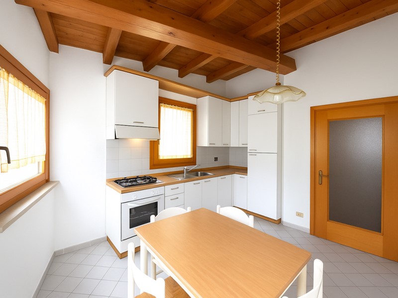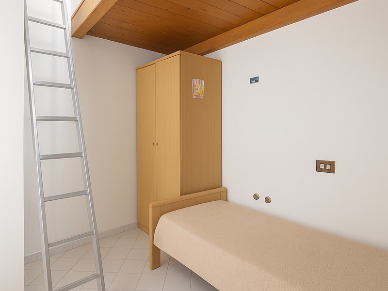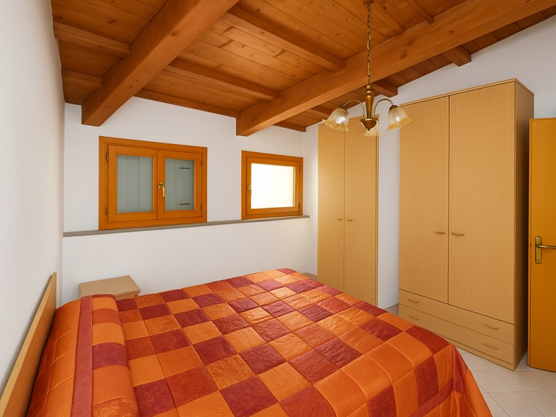 Una scala ci conduce al piano superiore dove troviamo la cucina ben arredata, una camera matrimoniale ed una cameretta con soppalco.