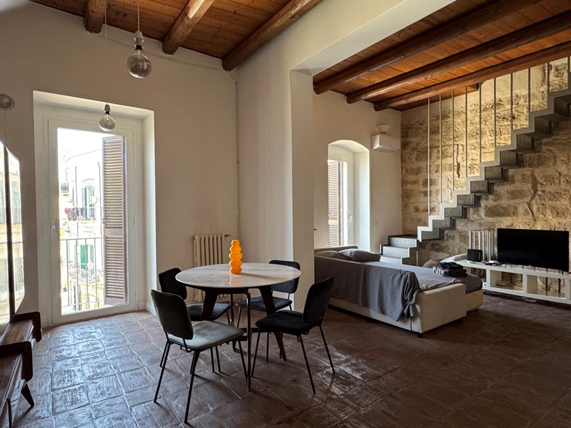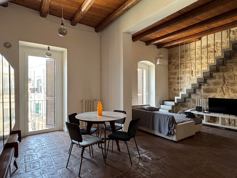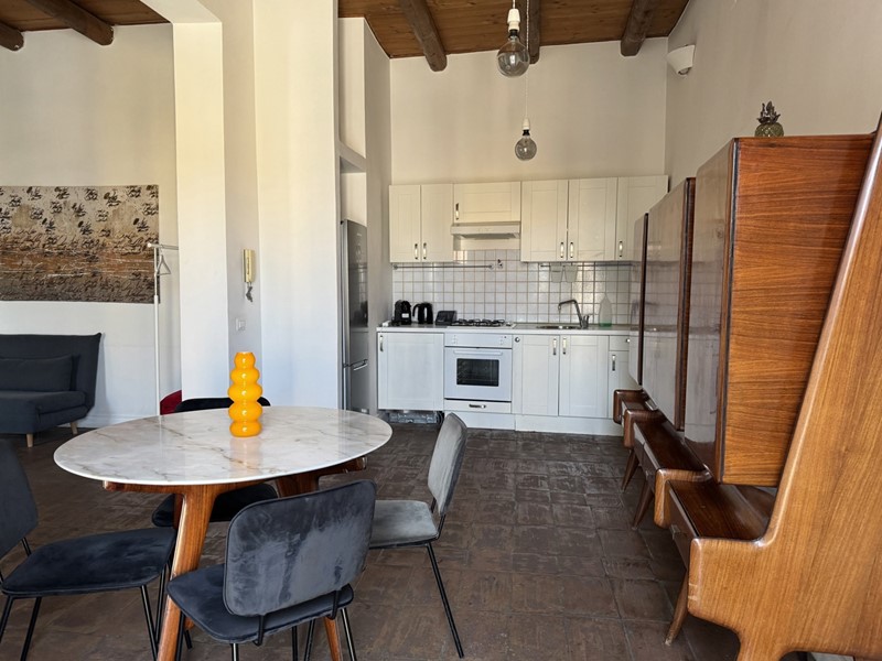 Con una bella scala, sapientemente inserita nel contesto, giungiamo in un open space. In questo grande ambiente, estremamente arioso e luminoso, lo spazio è solo idealmente diviso: il soggiorno ha un affaccio suggestivo sulla piazza; alla stessa maniera la zona pranzo con cucina a vista in stile minimalista, completa degli elettrodomestici, è posizionata davanti al secondo affaccio sulla piazza.