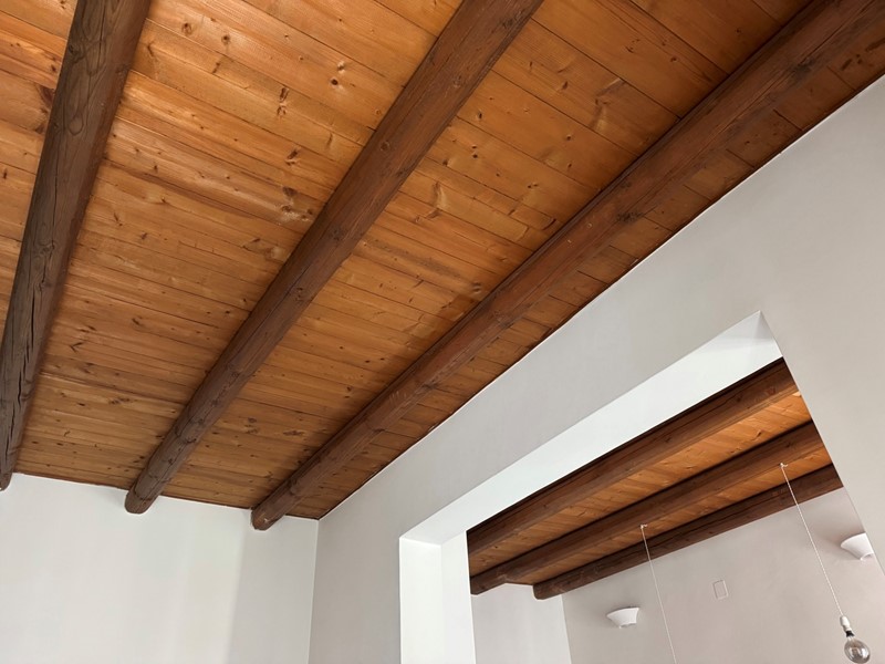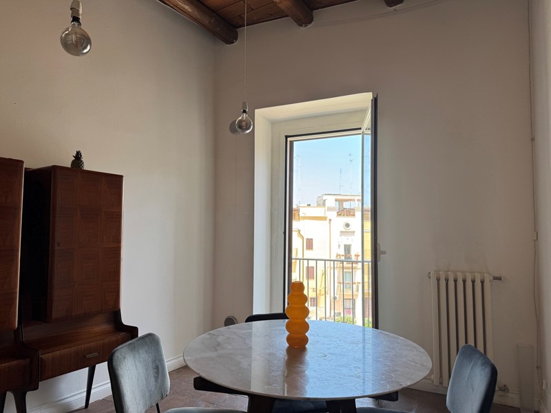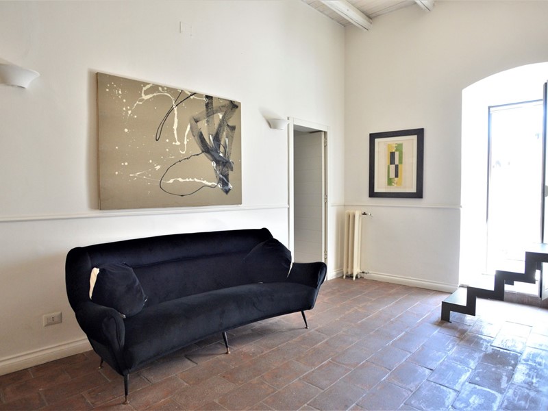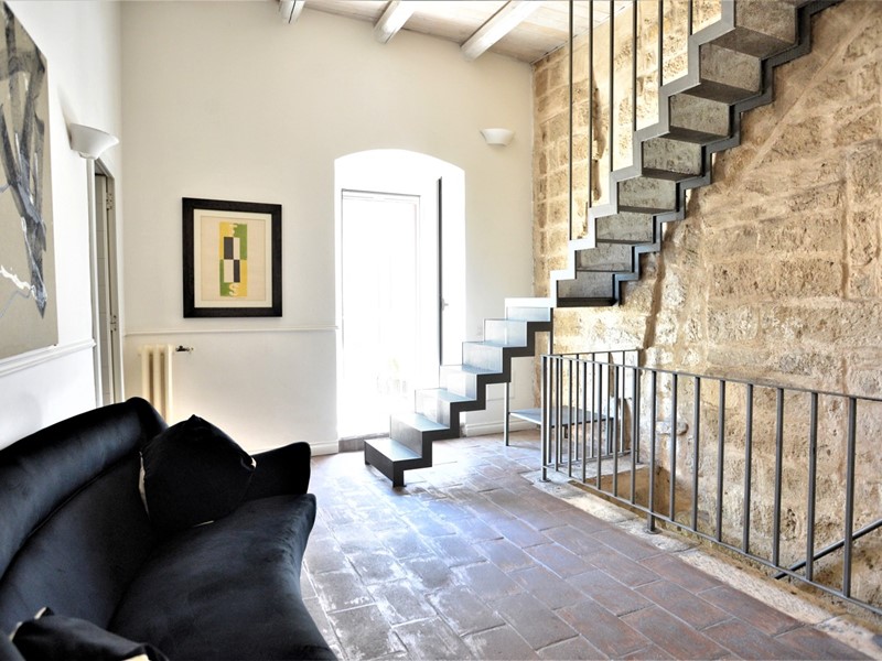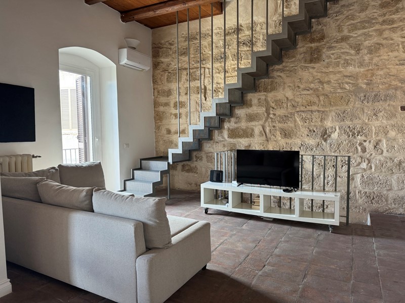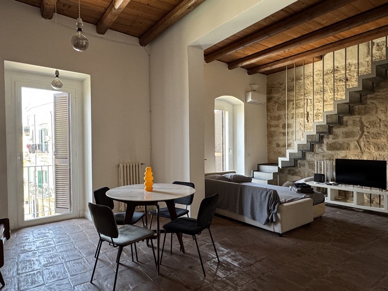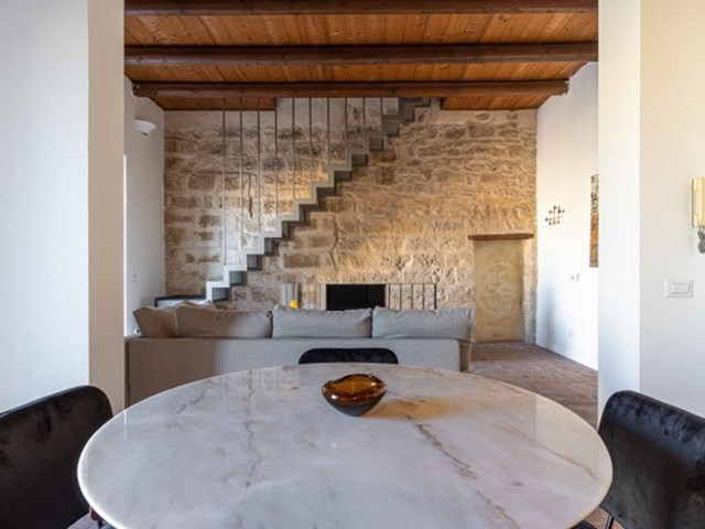 Con una bella scala, sapientemente inserita nel contesto, giungiamo in un open space. In questo grande ambiente, estremamente arioso e luminoso, lo spazio è solo idealmente diviso: il soggiorno ha un affaccio suggestivo sulla piazza; alla stessa maniera la zona pranzo con cucina a vista ha la piacevole vista sulla piazza.