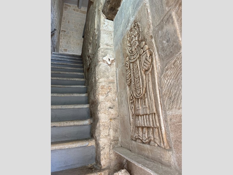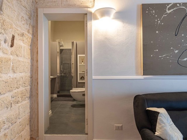 Entrando, il bassorilievo raffigurante San Nicola, che ci accoglie nelle scale in chianca che ci conducono al primo piano. Ci sorprende la luminosità del salotto, con le volte alte mt. 3,70, con il soffitto in travi di legno e l'affaccio sulla piazza, con il mare all'orizzonte; la camera da letto, affacciata sulla piazza, è comoda ed ampia. Il bagno è molto confortevole con una bella doccia.