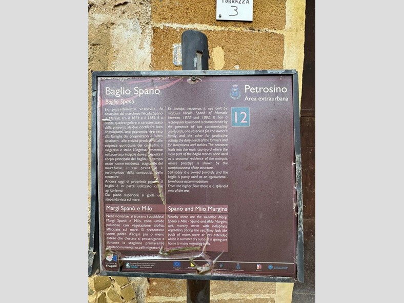 Il Baglio Spanò è una storica struttura rurale risalente alla fine del XIX secolo, costruita tra il 1873 e il 1882 dal marchese Nicolò Spanò di Marsala. Originariamente residenza estiva dell'antico casato Montalto Spanò, il baglio si distingue per le sue imponenti mura in tufo e l'ampia corte centrale, elementi tipici delle fattorie fortificate siciliane dell'epoca . ?