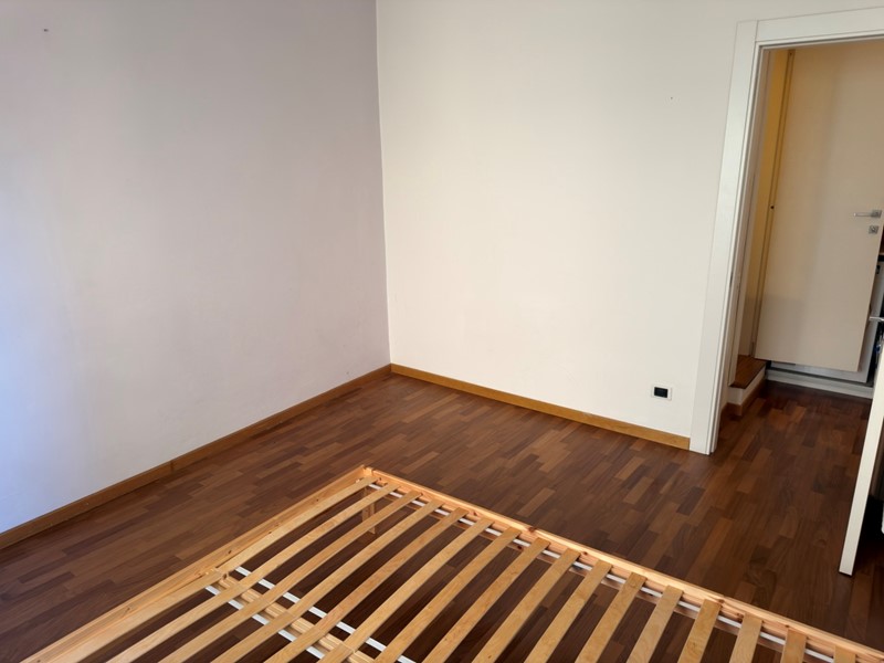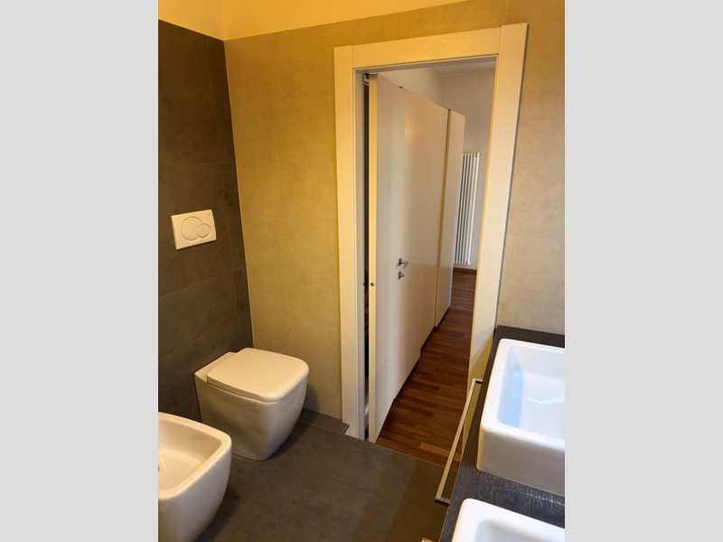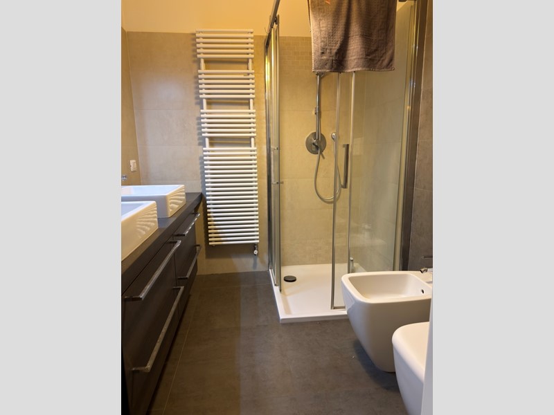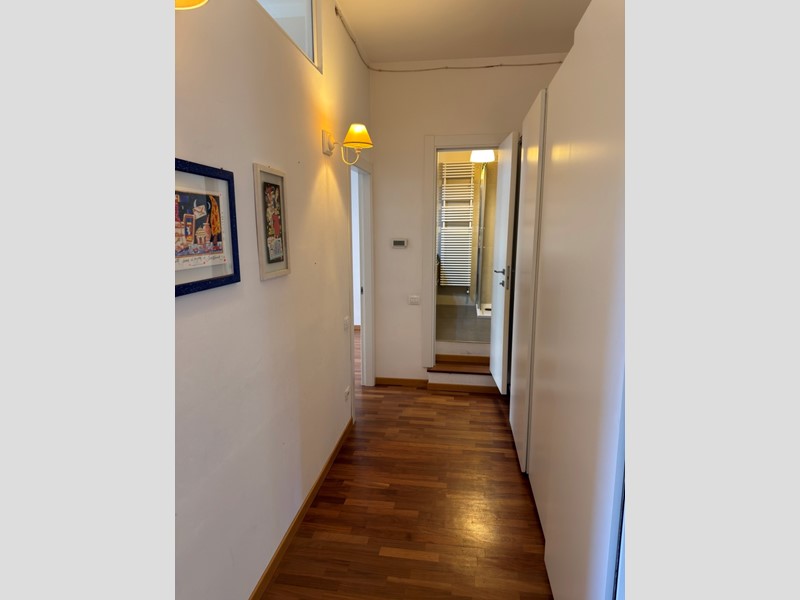 Si passa alla ZONA NOTTE, un corridoio di generose dimensioni, viene utlizzato come ripostiglio grazie a un grande armadio dove sono collocati lavatrice, asciugatrice e calderina. In fondo al corridoio un piccolo gradino porta al moderno bagno ben organizzato con lavabo doppio e doccia 1m x 1.