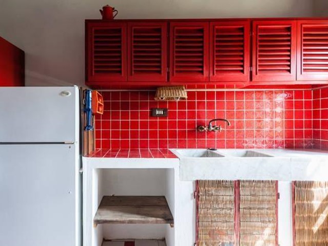 La cucina in muratura con bancone in marmo, oltre alla zona tinello per mangiare con gli amici; ambienti che non sono separati da murature, ma uniti dalle volte del soffitto che creano armonia tra gli spazi e sinergia con l'esterno.