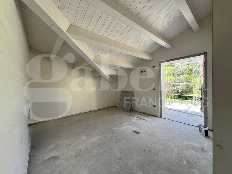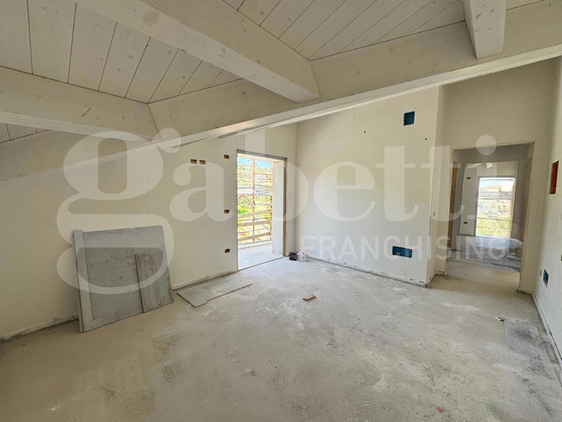 L'attico è composto da un ampio e luminoso soggiorno con travi a vista e accesso a un grande terrazzo, due camere da letto con balconi privati e due bagni finestrati con doccia. La cucina a vista è perfettamente integrata nello spazio living, creando un ambiente accogliente e funzionale.