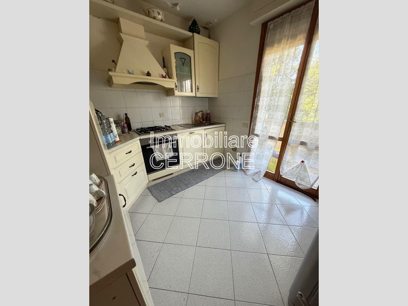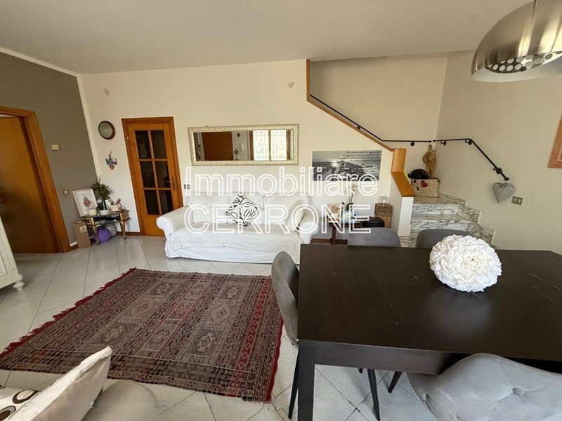 Al piano rialzato trova spazio una luminosa zona giorno che si compone di una sala, una cucina con uscita su terrazzo angolare, disimpegno e bagno finestrato con box doccia.