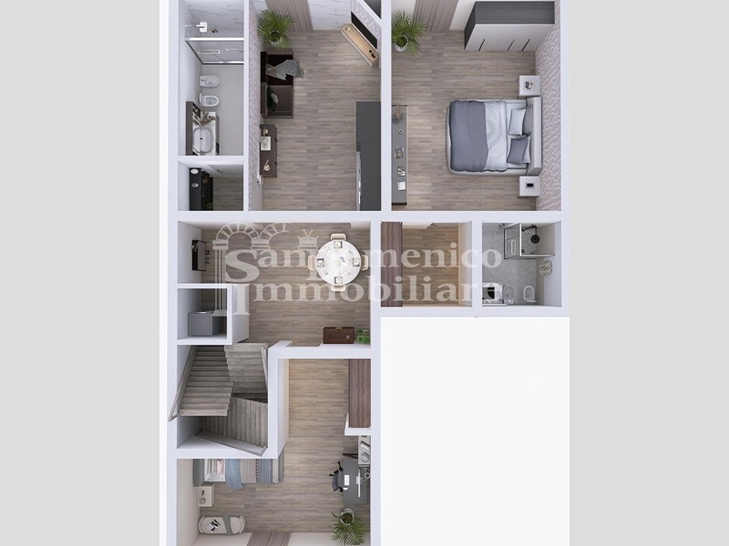 Tramite scala interna a comune con un'altra abitazione raggiungiamo l'ingresso dell'appartamento al secondo ed ultimo piano; l'immobile al suo interno è cosi composto: ampio ingresso, luminosa zona living con soggiorno- angolo cottura, disimpegno con angolo lavanderia a scomparsa, primo bagno con doccia e finestra, due camere, una matrimoniale e una singola, di cui vista la dimensione potrebbe accogliere una cabina armadio in muro e bagno con doccia.