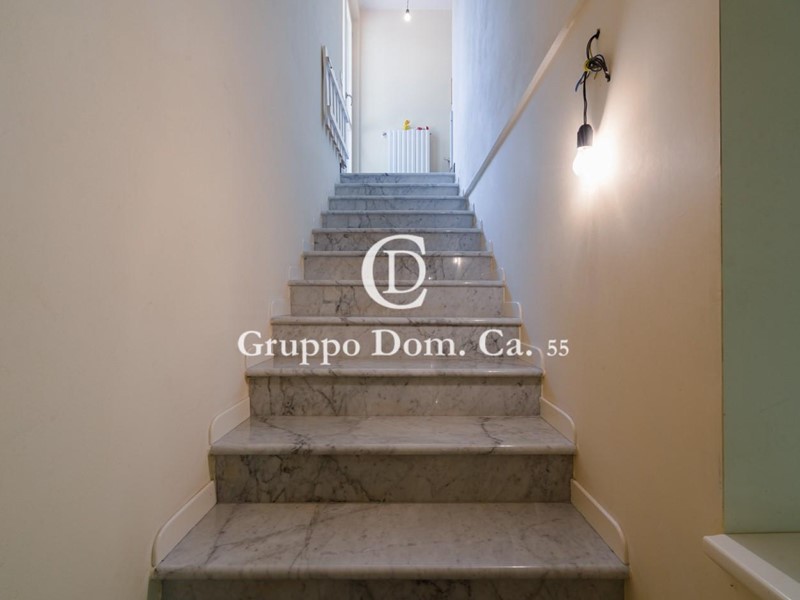 Una scala in marmo conduce al piano superiore, dove un luminoso corridoio vetrato distribuisce: