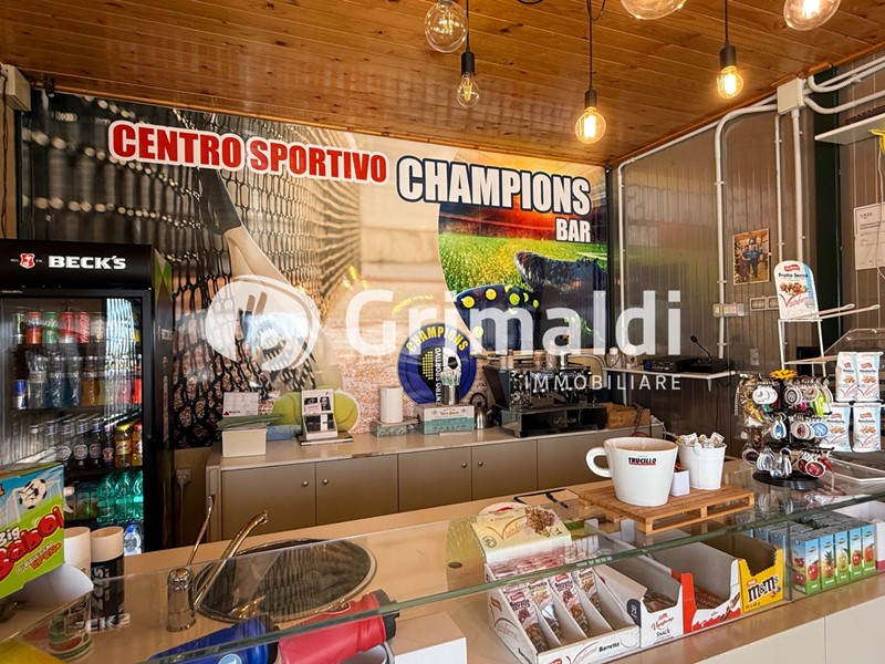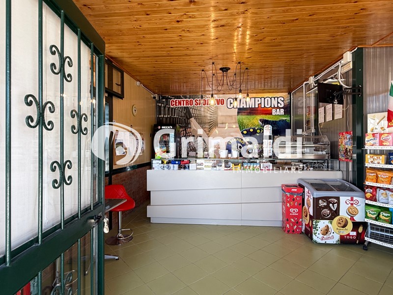 Bar attrezzato (6x6 m) con bagno interno per il personale, macchina del caffè, vetrina calda, frigo bevande, espositori snack, tavolini e sgabelli.