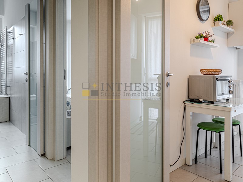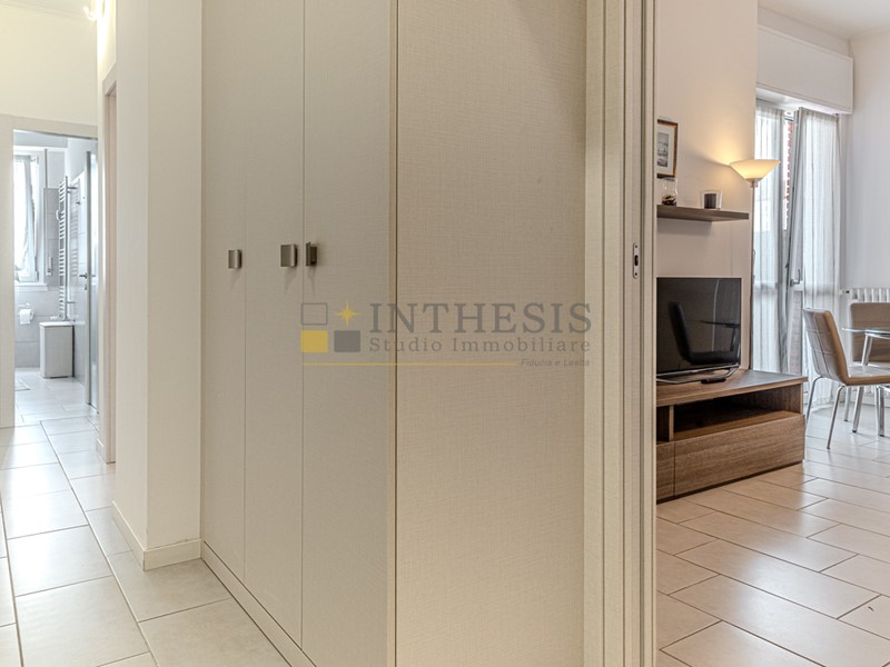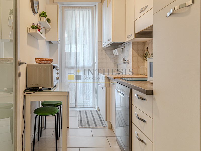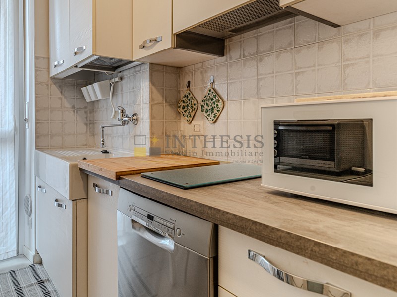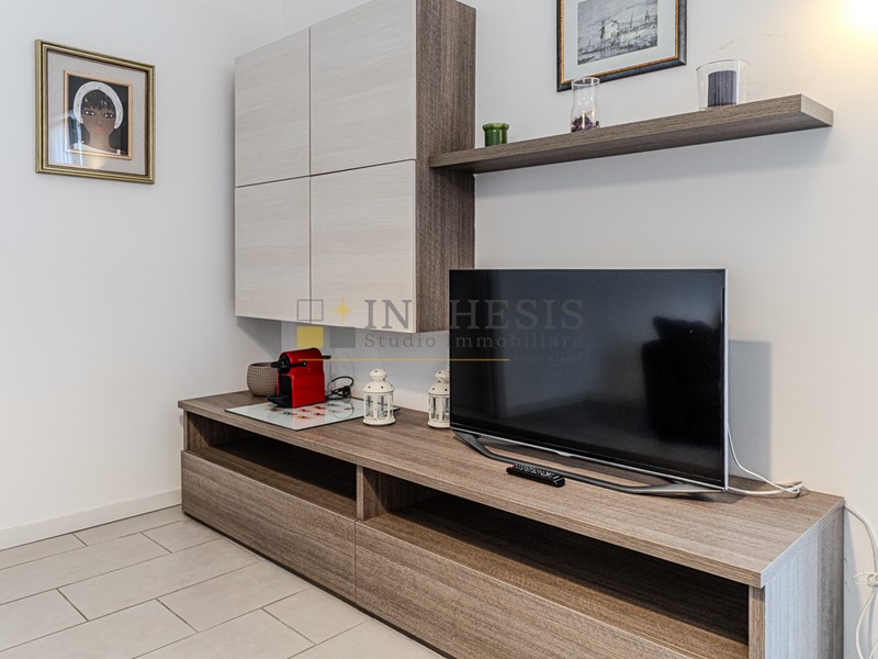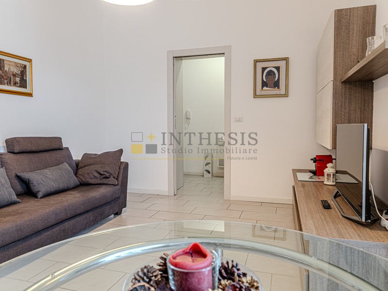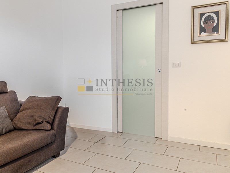 L’appartamento, luminoso e accogliente, è rifinito con gres porcellanato, porte rivestite in tessuto e arredamento moderno.