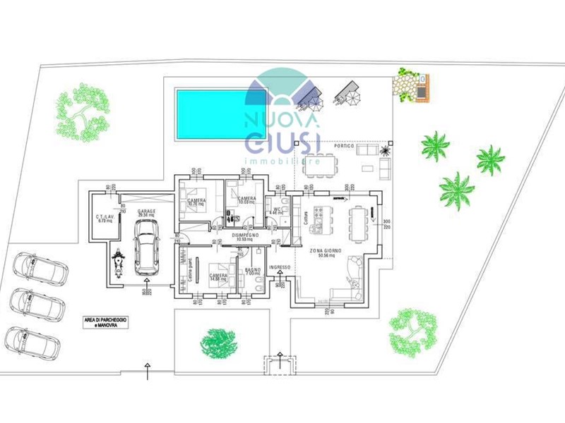 - Ingresso, incredibile zona living di 50 metri con cucina e soggiorno, disimpegno, due bagni, tre grandi camere, locale lavanderia, garage, portico e giardino esclusivo con possibilità piscina