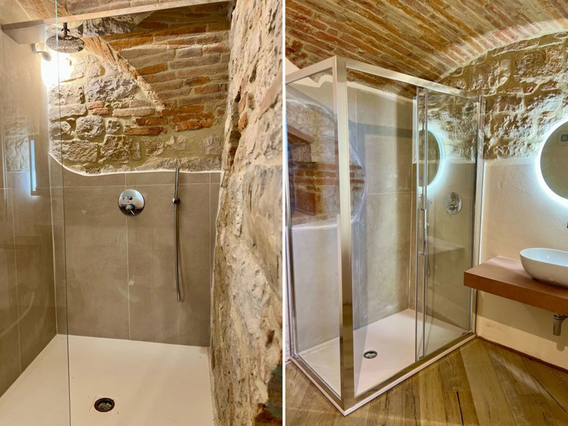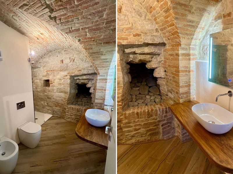 Ingresso con una scalinata rivestita in cotto, un ampio soggiorno con angolo cottura, tre camere matrimoniali, ognuno con bagno in camera, una zona SPA di 25mq con sauna e bagno turco , un bagno con lavanderia, e scendendo alcuni gradini troviamo un salottino con un balcone con vista panoramica sulla Media Valle del Tevere. Ad arricchire l'ambiente sono presenti due pozzi risalenti all'epoca romana. Soffitti a volta in mattoni. Ottimi finiture.