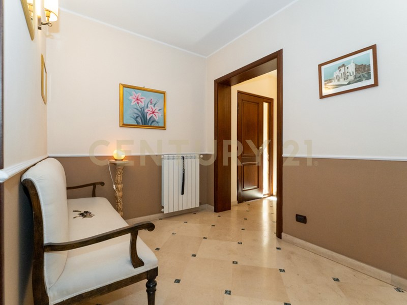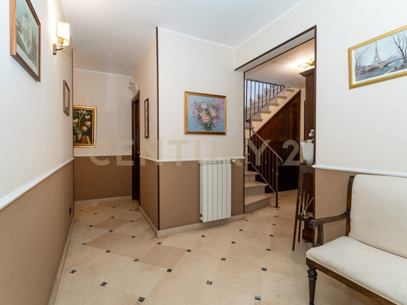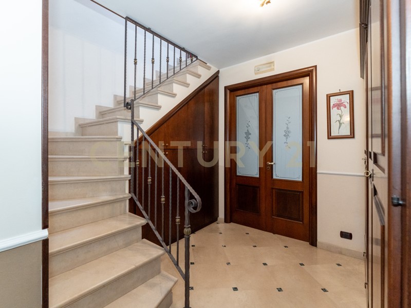 Il piano inferiore è interamente pavimentato in marmo, inclusi i gradini delle due scale interne in marmo poste agli estremi dell’abitazione, che collegano i livelli con una distribuzione equilibrata.