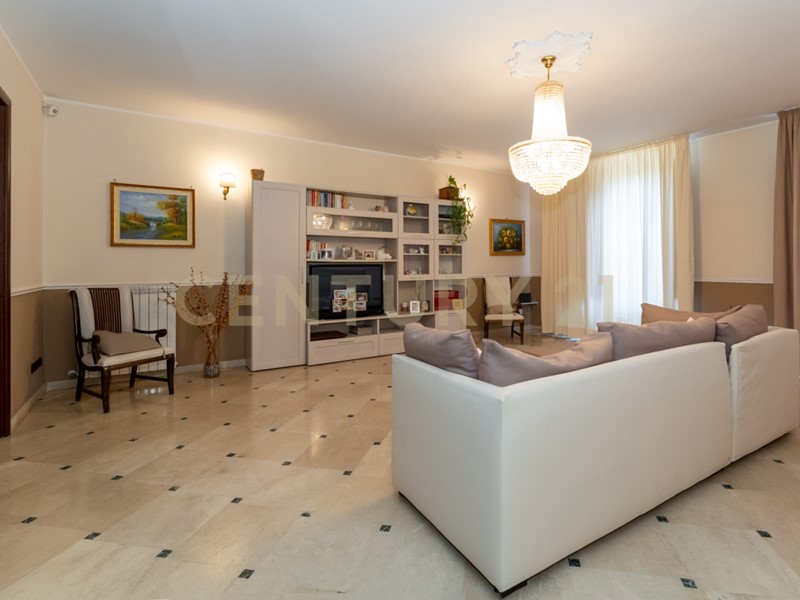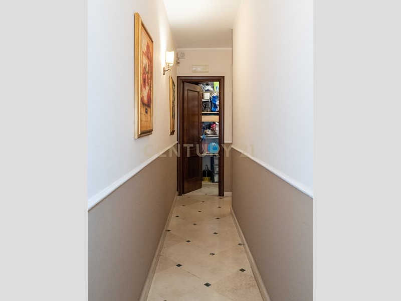 The lower floor is entirely finished in marble, including the steps of the two internal marble staircases positioned at opposite ends of the property, creating balance and architectural continuity between levels.